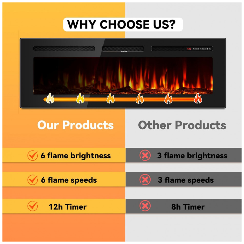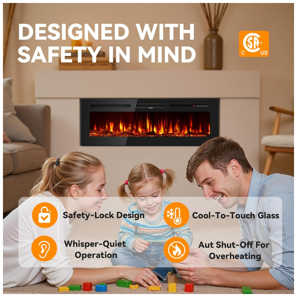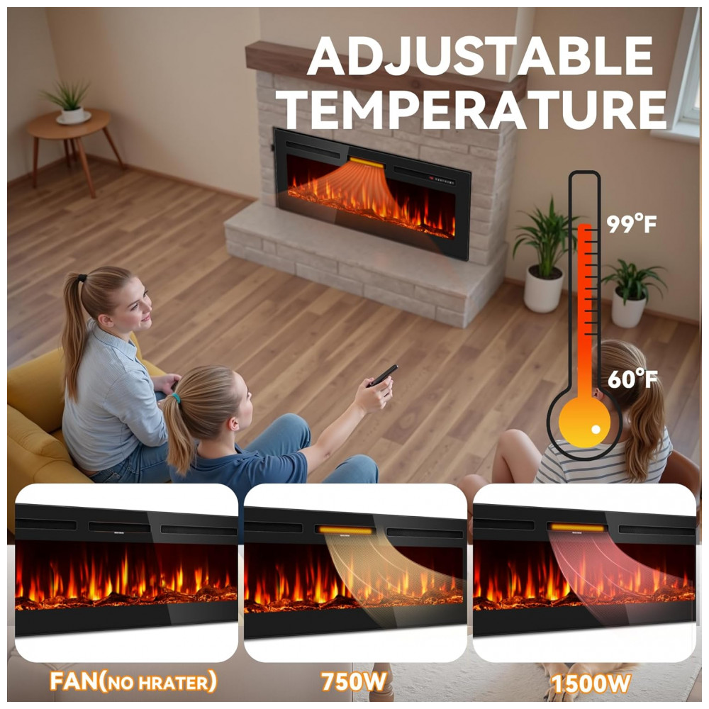 Lareira Elétrica de 127 cm Embutida ou de Parede Ultrafina Aquecedor Linear 750/1500W com Chama Realista Alta Temperatura Baixo Ruído Tehanld