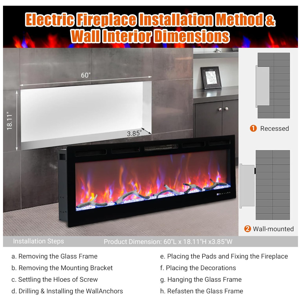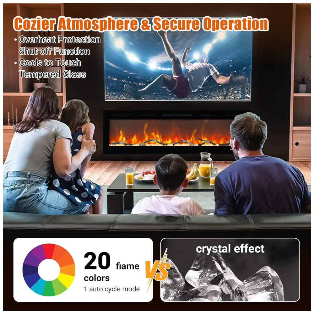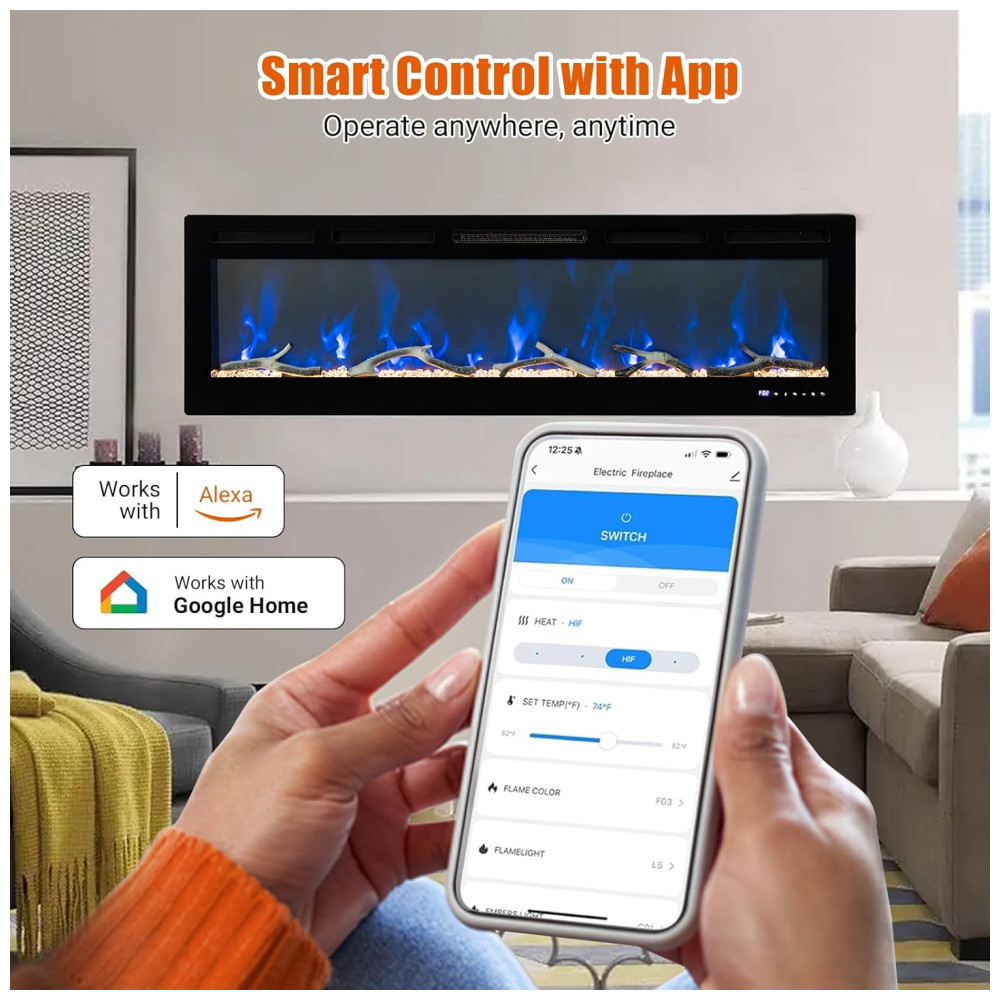 Lareira Elétrica de 152 cm Embutida ou de Parede com LED Touch Controle Remoto e App Wi-Fi. Aquecedor 1500/750W 12 Cores Ajustáveis TimerAsyPets
