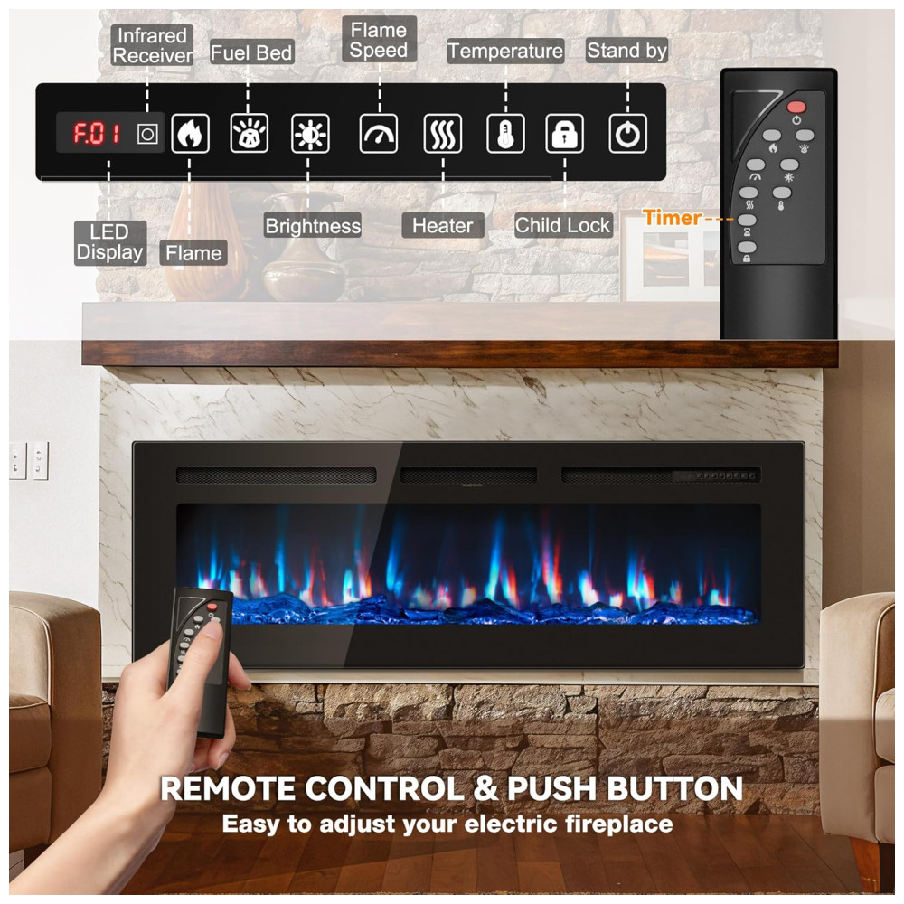 Lareira Elétrica de 152 cm Embutida ou de Parede Controle Remoto Aquecedor 1500/750W (15-37°C) 12 Cores Ajustáveis Timer TroncosManastin