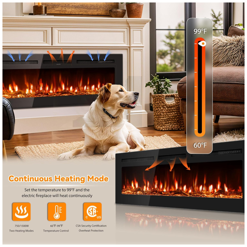 Com uma faixa de ajuste de temperatura mais ampla, você pode definir a temperatura perfeita para seu espaço entre 60 e 99 C. Quando você define a temperatura para 99 C, a lareira elétrica ativará o modo de aquecimento contínuo. Com uma saída de calor de 5000 BTU, ela pode fornecer aquecimento auxiliar para uma área de 37,16 m2. Os dois modos de aquecimento, 750 W e 1500 W, podem ser alternados livremente, proporcionando uma experiência flexível e confortável, quer você precise de um ambiente aconchegante ou de calor extra.