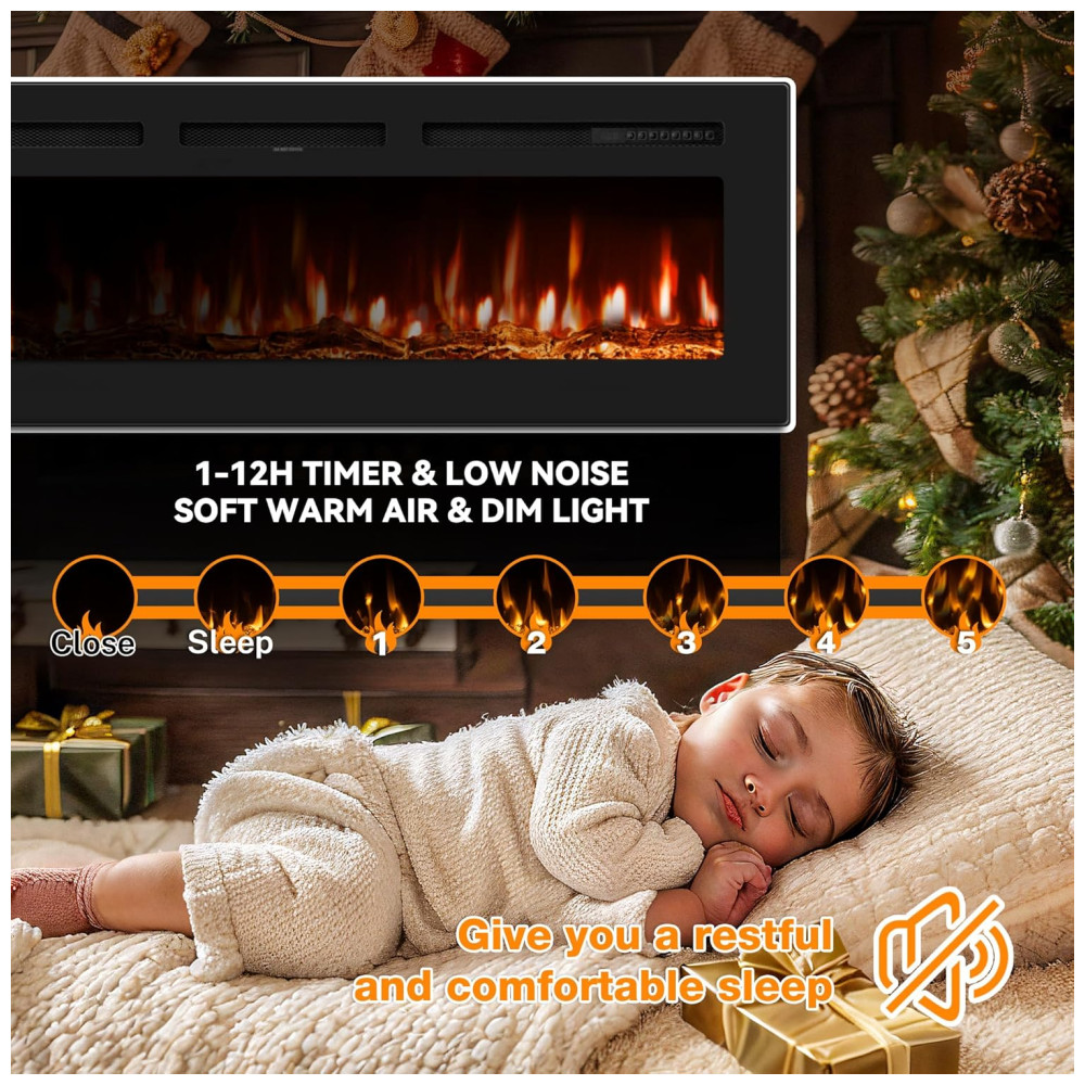 Esta lareira elétrica de parede é certificada pela CSA e equipada com proteção contra superaquecimento, que desliga automaticamente o dispositivo quando a temperatura está muito alta, garantindo uma operação segura e confiável. Você também pode ativar a função de bloqueio para crianças após concluir todas as configurações para evitar efetivamente que crianças ou animais de estimação o operem acidentalmente.
