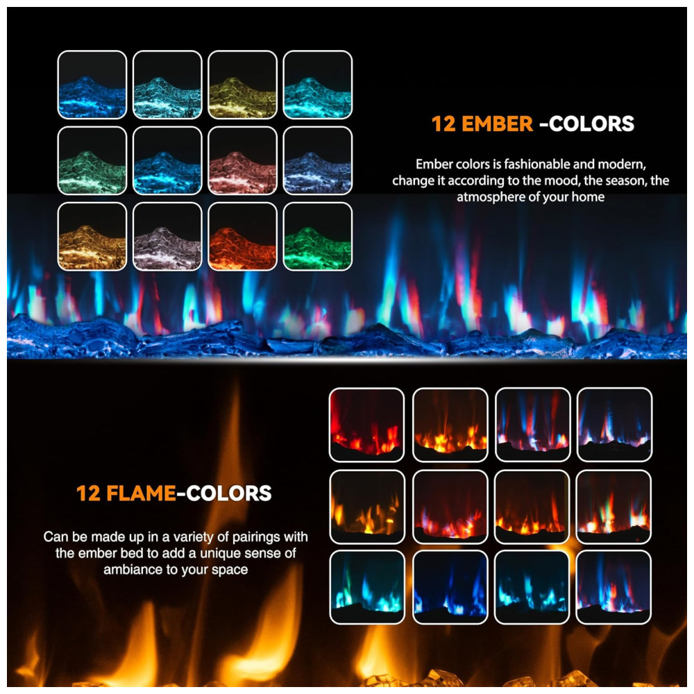 Esta lareira elétrica de parede possui uma estrutura de metal requintada e um elegante painel de vidro temperado preto, com um design moderno. Com 12 cores de chamas e 12 cores de base de fogo para escolher, ela adiciona um toque de elegância a qualquer espaço. Além disso, um saco de pedras de cristal grátis é fornecido para decoração. O efeito realista da chama combinado com as pedras cristalinas cria uma experiência sensorial incomparável. É adequado para salas de estar, quartos, salas de jantar, escritórios, home theaters e até mesmo RVs.