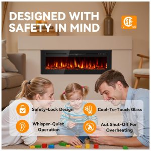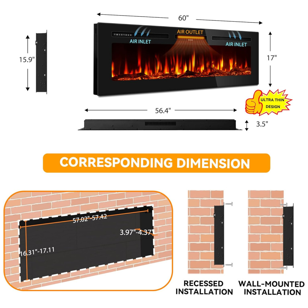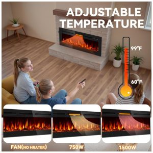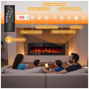 Lareira Elétrica de 152 cm Embutida ou de Parede Ultrafina Aquecedor Linear 750/1500W com Chama Realista Alta Temperatura Baixo RuídoTehanld