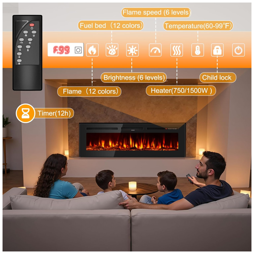 Característica especial Trava para crianças, Máximo 99, Chama e leito de combustível 12 cores, Velocidade da chama e brilho 6 níveis, Aquecedor 750 1500W