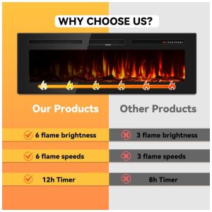 A lareira elétrica de parede Tehanld 2024A é uma atualização com um aquecedor elétrico premium que fornece maior saída de calor e operação mais silenciosa do que os modelos padrão no mercado. Com recursos fáceis de usar, chamas realistas, corpo ultrafino, tela LED anti escaldante e várias cores de chama e ajustes de brilho, este modelo oferece um ótimo equilíbrio entre qualidade e preço acessível.Você também tem a opção de desligar o modo de aquecimento e exibir apenas as chamas, criando uma atmosfera aconchegante em casa ou um ambiente sofisticado em espaços comerciais. Este produto possui uma trava de segurança para crianças, tornando o perfeito para famílias com crianças. A tela permanece em uma temperatura segura, para não queimar suas mãos. Ele opera em torno de 40,0 dB, garantindo um ambiente silencioso, e também inclui proteção contra superaquecimento. Oferecemos seis níveis de brilho e velocidades de chama para atender à sua busca por uma melhor qualidade de vida. Além disso, há um modo de temporizador que dura até 12 horas, para que você nunca mais acorde com frio no meio da noite. Escolha entre 12 cores de chama e 12 cores de leito de brasa, permitindo 144 combinações de cores possíveis, para que você possa desfrutar de um arco íris de cores em casa. Também fornecemos troncos falsos e pedras de cristal para opções de decoração adicionais. Esta lareira elétrica pode ser instalada como uma unidade embutida, parcialmente embutida ou montada na parede. Não ocupa espaço no chão, o que o torna uma escolha ideal para quem tem espaço limitado.