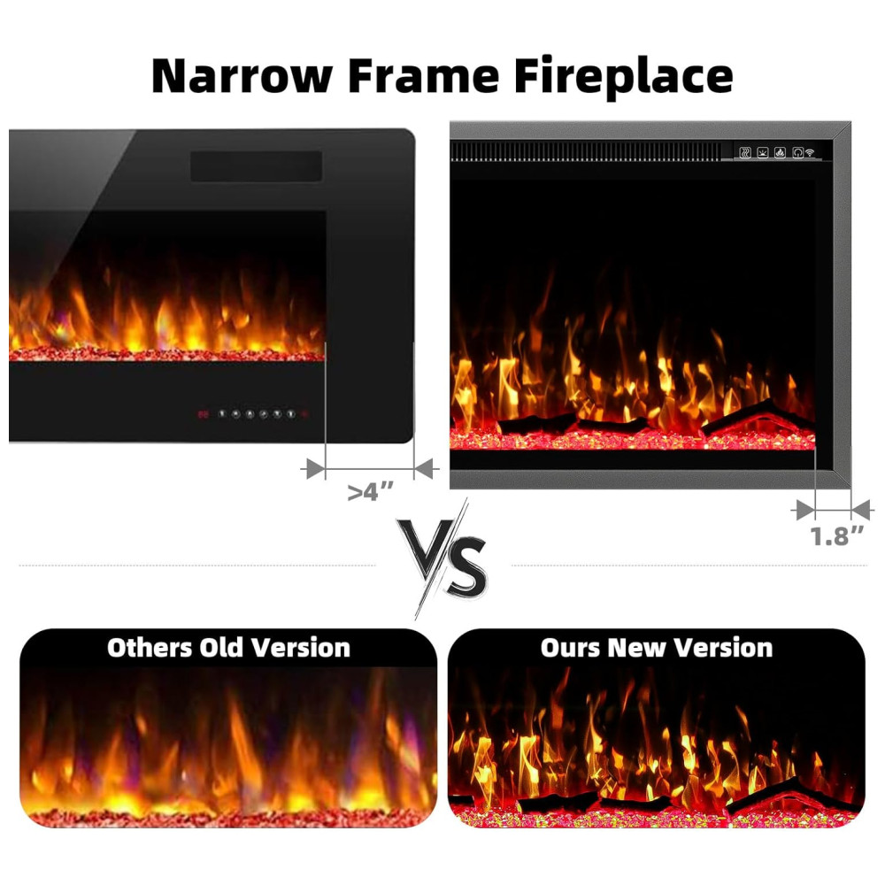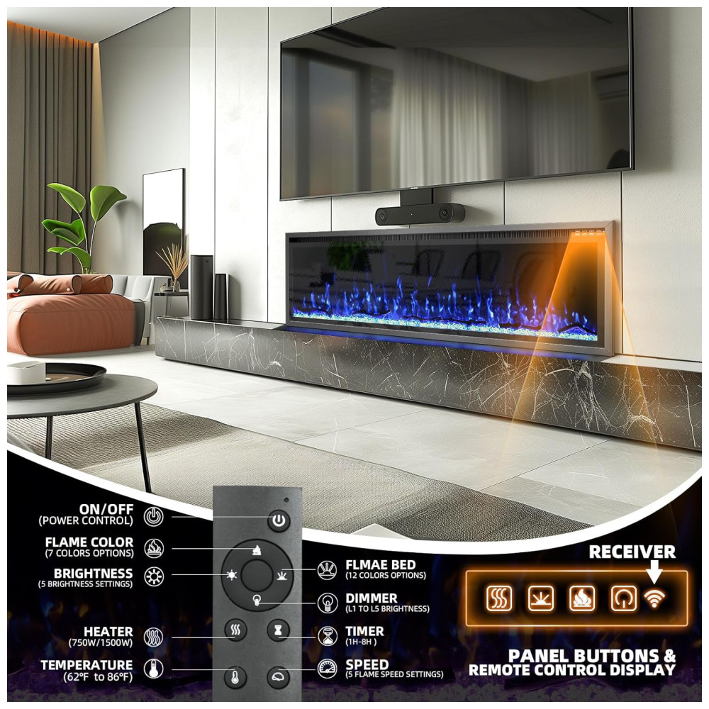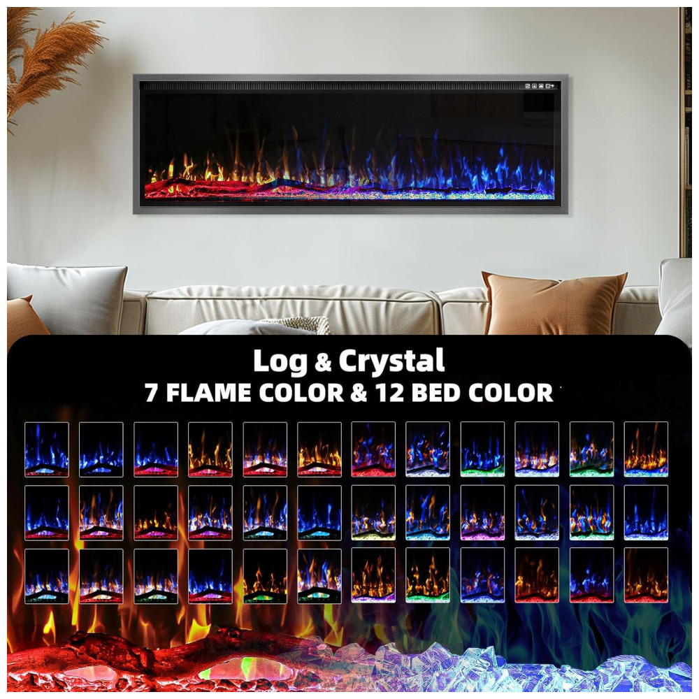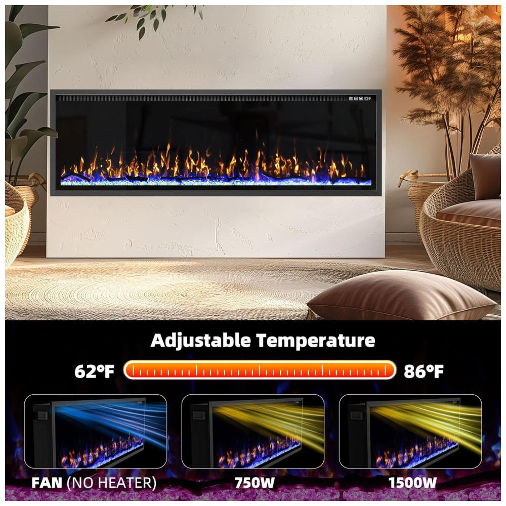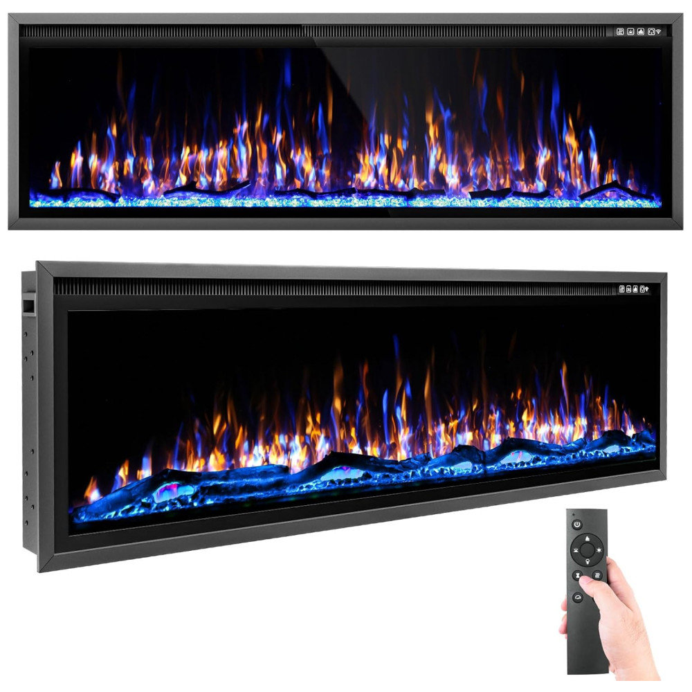Lareira Elétrica de 152 cm Ultrafina Embutida ou de Parede Troncos Madeira Flutuante ou Cristais Controle Remoto Termostato Kucreiheat
