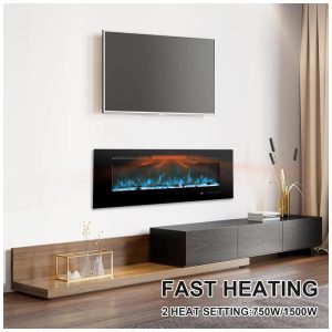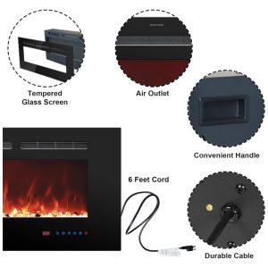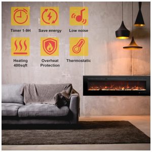 A lareira elétrica da RODALFLAME de 76,2 cm foi projetada com saída de calor frontal para ser embutida na parede, podendo também ser montada de forma fácil com suportes, ocupando pouco espaço. Perfeita para salas de estar, quartos, salas de jantar, escritórios e outros ambientes. Com 13 cores de chamas e 13 cores de leito de combustível, oferece um máximo de 169 combinações de cores, proporcionando o ambiente ideal. Utilize troncos e cristais para criar um efeito de chama realista, sem cinzas ou gases, trazendo um design moderno e belo para sua casa. O aquecedor de lareira conta com 2 configurações de calor (750W-1500W) para aquecer até 37m², podendo ser utilizado apenas o efeito de chama para economizar energia. Além disso, possui timer de 19 horas, controle remoto e tela sensível ao toque. Seguro e confortável, proporciona uma experiência de aquecimento sem fumaça e poeira, com proteção contra superaquecimento e vidro temperado resistente a explosões. Com certificação CSA, é seguro para crianças e animais de estimação. Dimensões totais: 76cm x 45cm x 15cm. Para mais informações, consulte a ficha de especificações no manual do usuário.