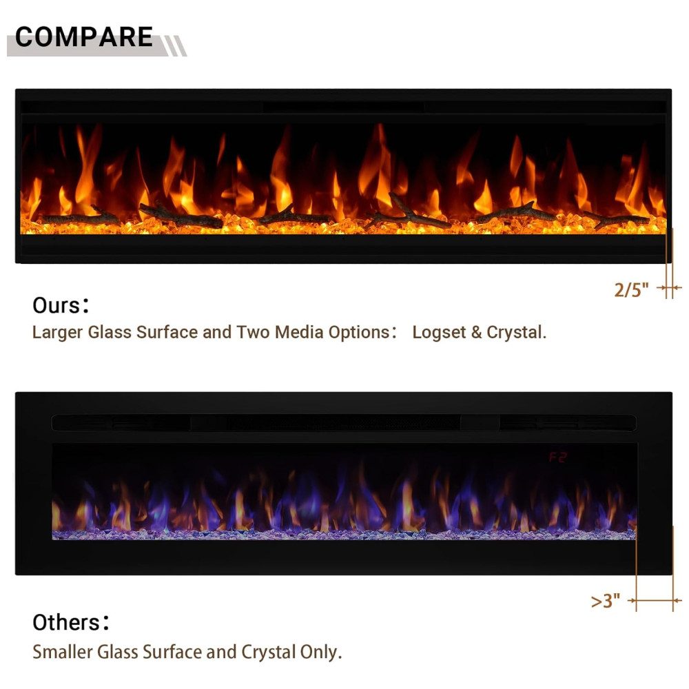 Esta lareira elétrica apresenta um design elegante com uma moldura ultrafina, proporcionando um efeito visual sofisticado que as lareiras comuns não oferecem. A moldura estreita e a ampla superfície de vidro frontal destacam um efeito de chama mais colorido e realista. Projetada para instalação embutida na parede ou para ser pendurada, a lareira inclui toras e cristais decorativos, oferecendo 4 opções de cores de chama e 4 níveis de brilho ajustáveis.