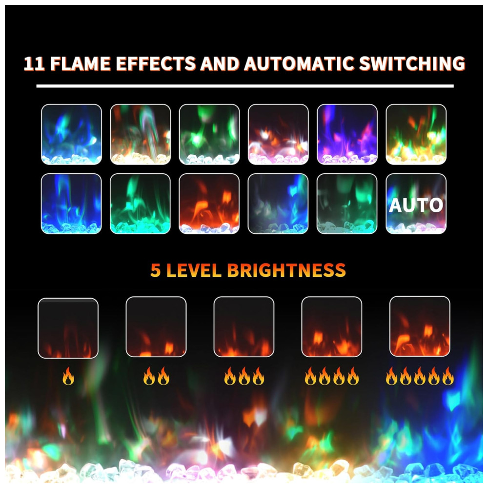 Efeitos de Chama Aprimorados: O número de efeitos de chama da lareira elétrica foi aumentado para 11, com efeitos de chama automáticos e aleatórios, mudanças automáticas de cor da chama, ajuste de brilho em 5 níveis e 14 efeitos de leito de carvão, tornando o ambiente cheio de arte e atmosfera.