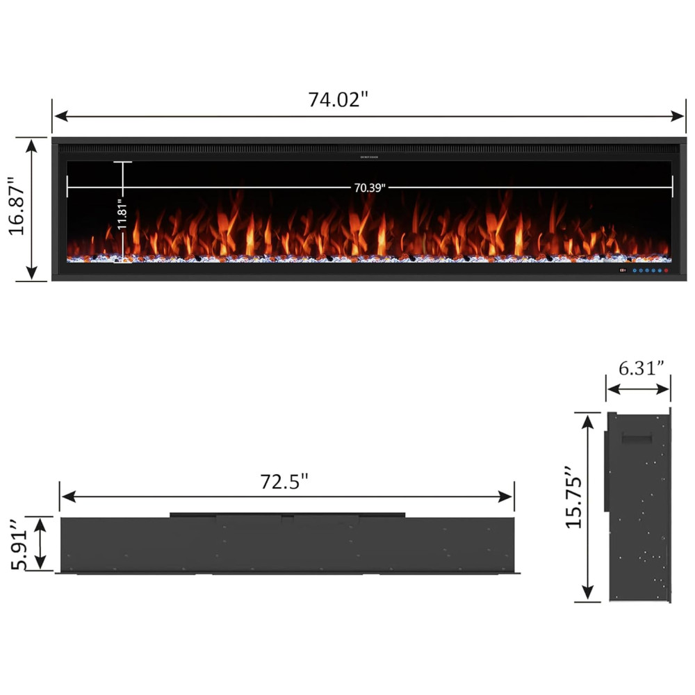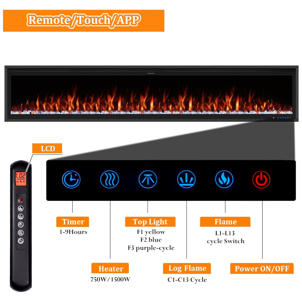 As chamas são altamente realistas e oferecem recursos avançados, incluindo 13 cores de chama ajustáveis, 13 cores de chama para o leito de combustível e 3 cores de luz superiores. Isso permite uma ampla gama de opções de cores, proporcionando uma experiência visual personalizada. O temporizador pode ser configurado para até 19 horas, e há proteção contra superaquecimento para maior segurança. A lareira é capaz de aquecer um espaço de até 37 metros quadrados e vem equipada com cristais de toras.