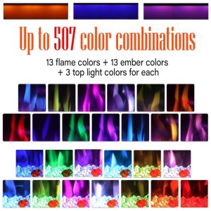 As chamas são altamente realistas e oferecem recursos avançados, incluindo 13 cores de chama ajustáveis, 13 cores de chama para o leito de combustível e 3 cores de luz superiores. Isso permite uma ampla gama de opções de cores, proporcionando uma experiência visual personalizada. O temporizador pode ser configurado para até 19 horas, e há proteção contra superaquecimento para maior segurança. A lareira é capaz de aquecer um espaço de até 37 metros quadrados e vem equipada com cristais de toras.