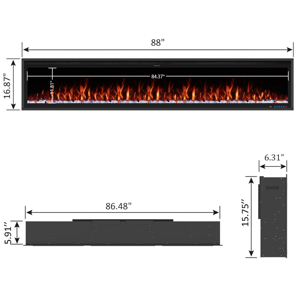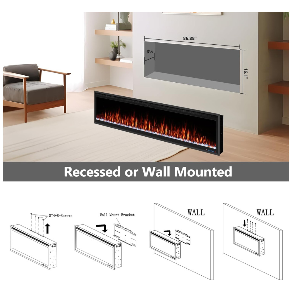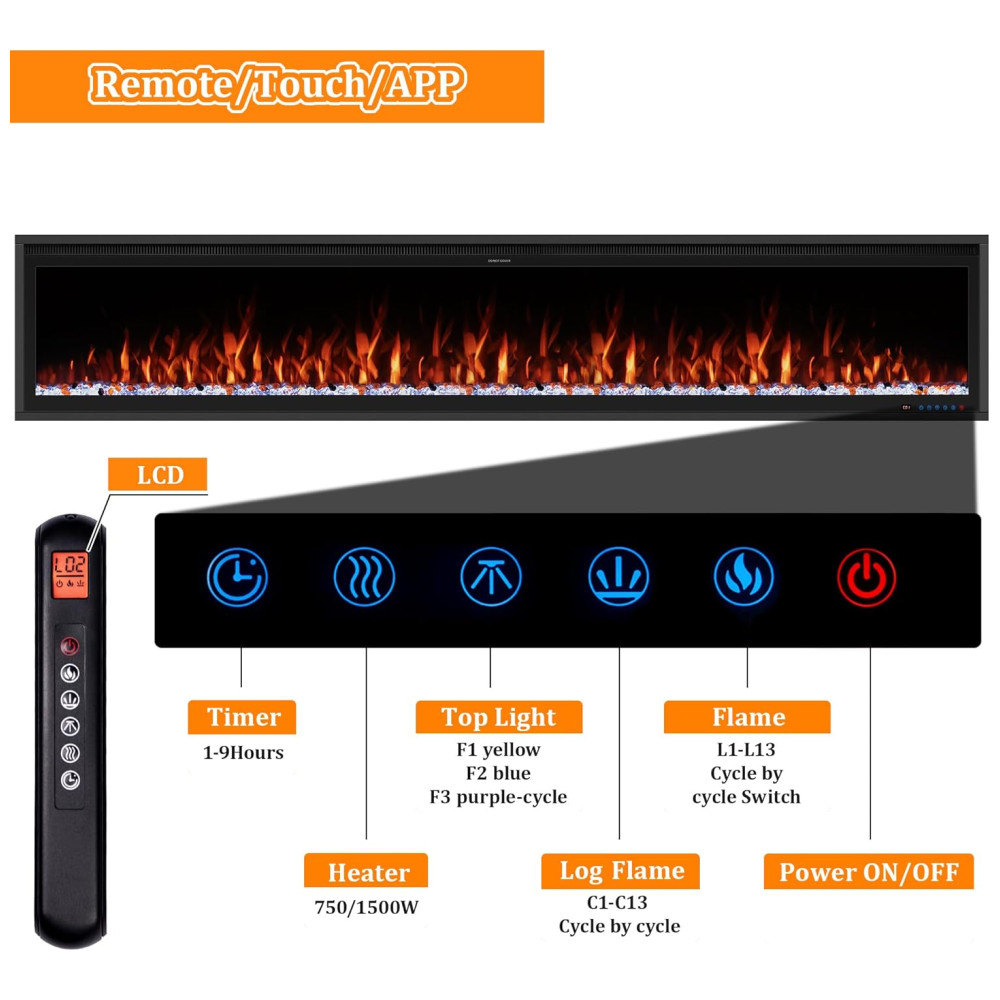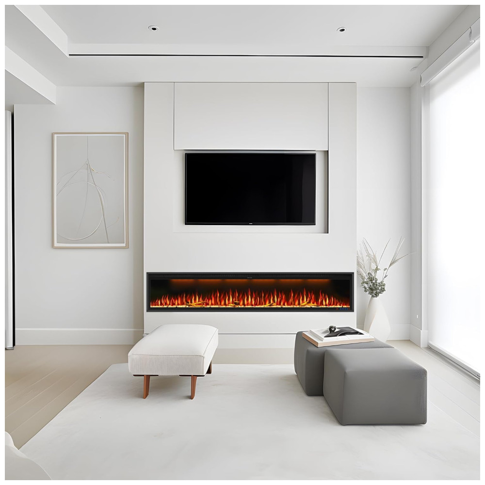 Lareira Elétrica de Embutir A42x223L cm com Controle Remoto por APP Wi-Fi Chamas 3D Realistas Temporizador Toras e Cristais 110V 1500W Benrocks BI88Z Preta