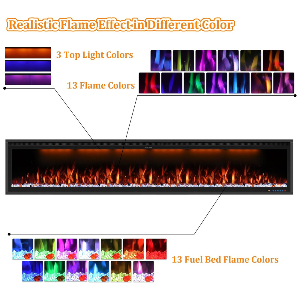 Crie a atmosfera perfeita com 13 cores de chama ajustáveis, 13 cores de leito de combustível e 3 cores de luz superior. Personalize sua experiência visual com uma variedade de combinações de cores. Equipado com um temporizador de 1 a 9 horas, proteção contra superaquecimento e opções de potência de 750W e 1500W, esta lareira aquece um espaço de até 37 m² com facilidade. Inclui troncos e cristais para um toque adicional de realismo.