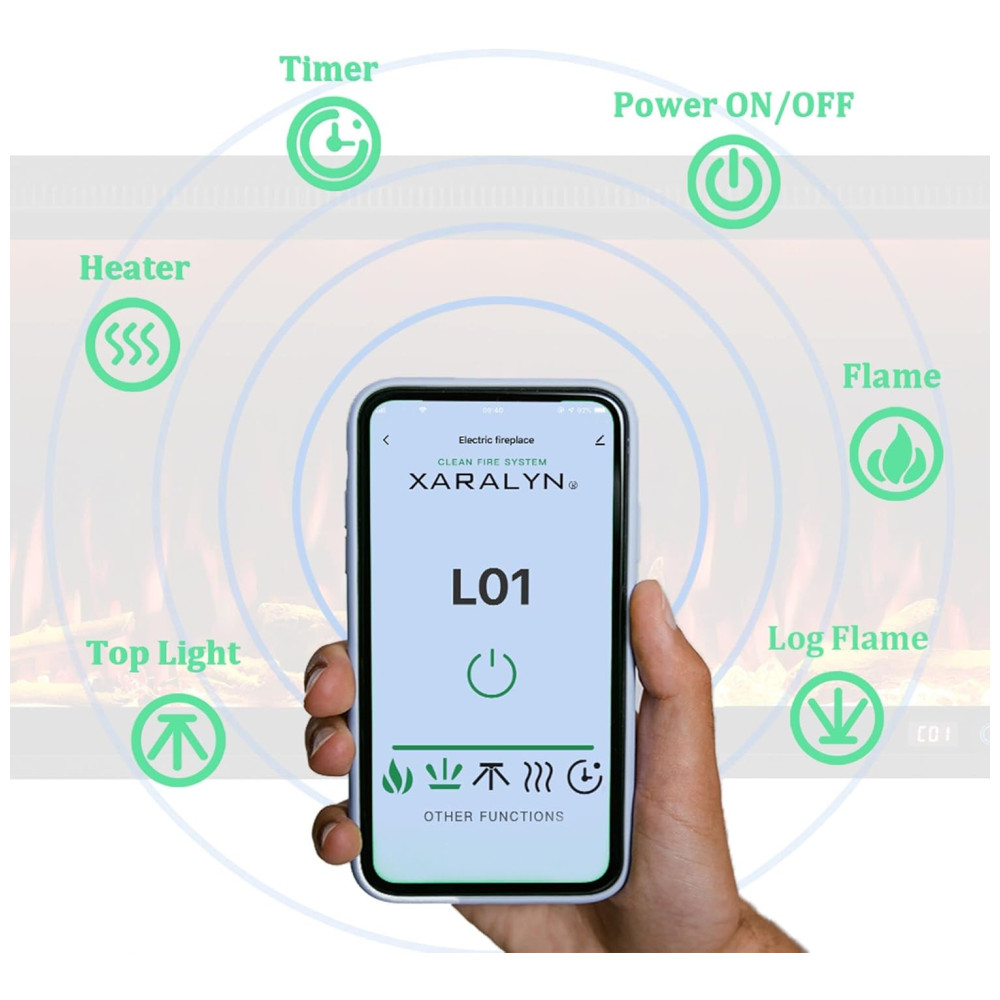 A lareira elétrica inteligente Benrocks pode ser controlada de várias maneiras: controle remoto, tela sensível ao toque ou através do aplicativo “Xaralyn Smart”. Baixe o aplicativo em seu smartphone, pressione o botão “Flame Setting” e siga as instruções para configurar facilmente.