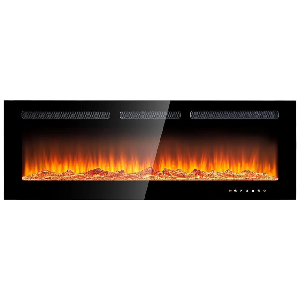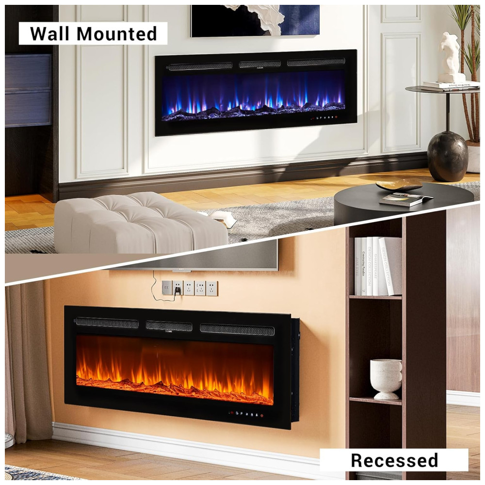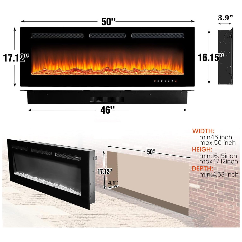 A lareira elétrica WallMounted Recessed oferece uma opção moderna e confortável para qualquer lar. Com suas dimensões de 127 cm de largura, 9,4 cm de profundidade e 43 cm de altura, esta inserção de lareira elétrica de 50 polegadas foi projetada para montagem embutida na parede. Com acabamento em vidro temperado preto e design elegante, ela adiciona um toque de estilo contemporâneo ao ambiente.