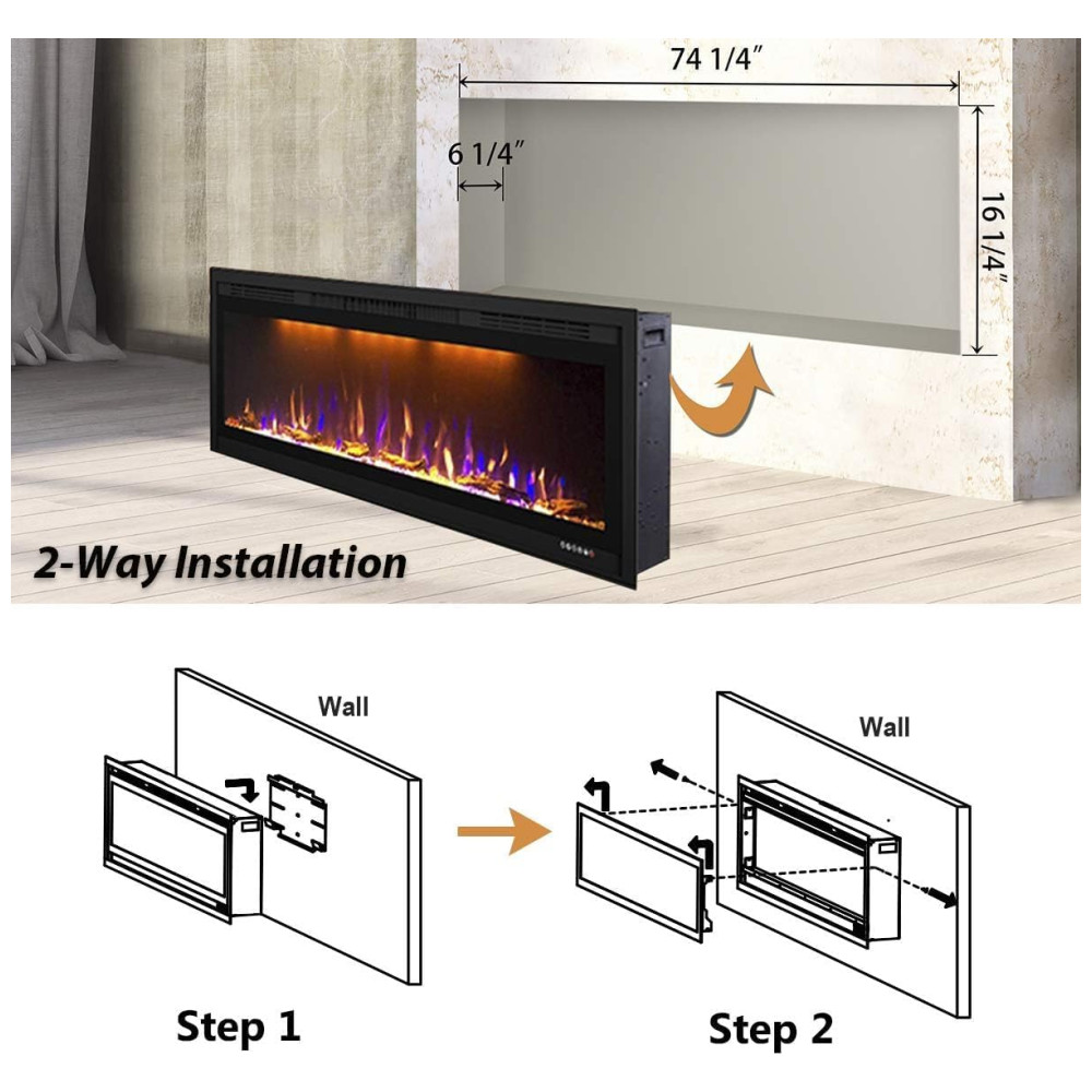 DUAS MANEIRAS DE INSTALAÇÃO 194, de largura x 14, de profundidade x 45 centímetros de altura Com ventilação frontal superior, esta lareira foi projetada para instalação montada na parede e embutida, que pode fornecer aquecimento suplementar para uma sala de até 37 metros quadrados 5120 BTU Cabo de alimentação de 6 pés 1,83 metros