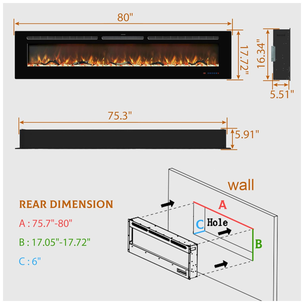Lareira Elétrica de Embutir A43x203L com Controle Remoto Temporizador e Chamas Multicolorida 110V Kentsky Preta