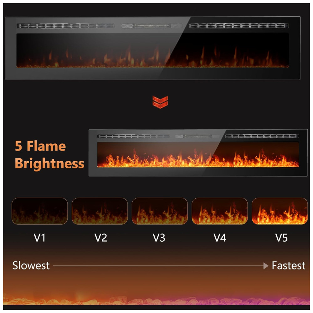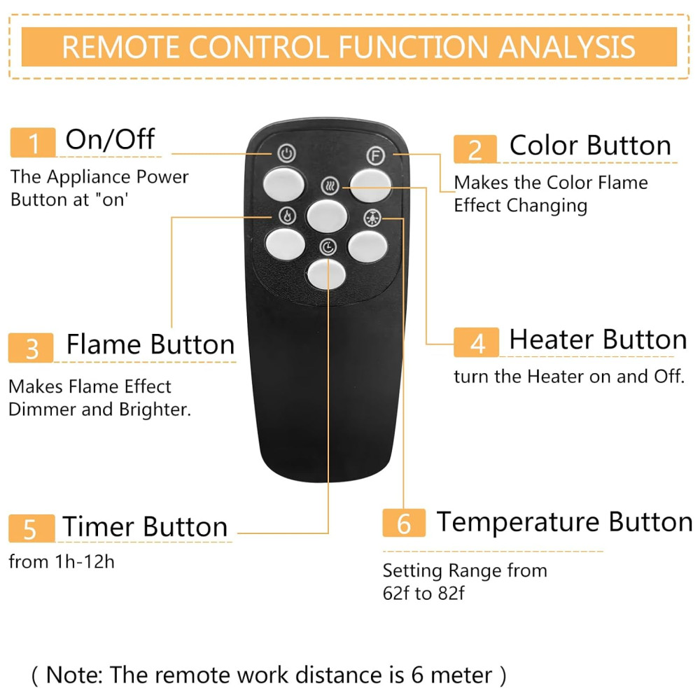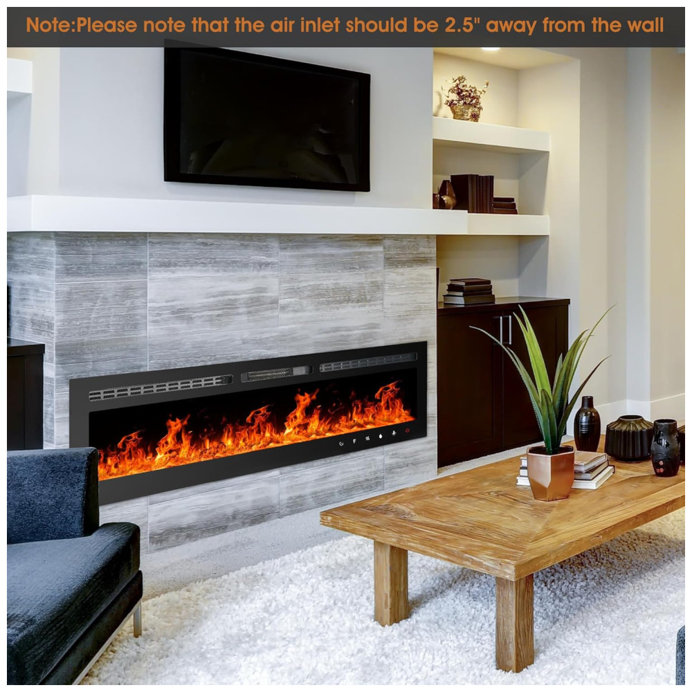 Controle de Temporizador de 1 12 Horas: interruptor independente de aquecimento e chama, cor e velocidade da chama ajustáveis, função de modo de suspensão. O principal design de switch físico independente passou pela certificação de segurança ETL. Vários métodos de instalação Esta lareira elétrica não só pode ser embutida ou semi embutida na parede, mas também pode ser montada na parede.