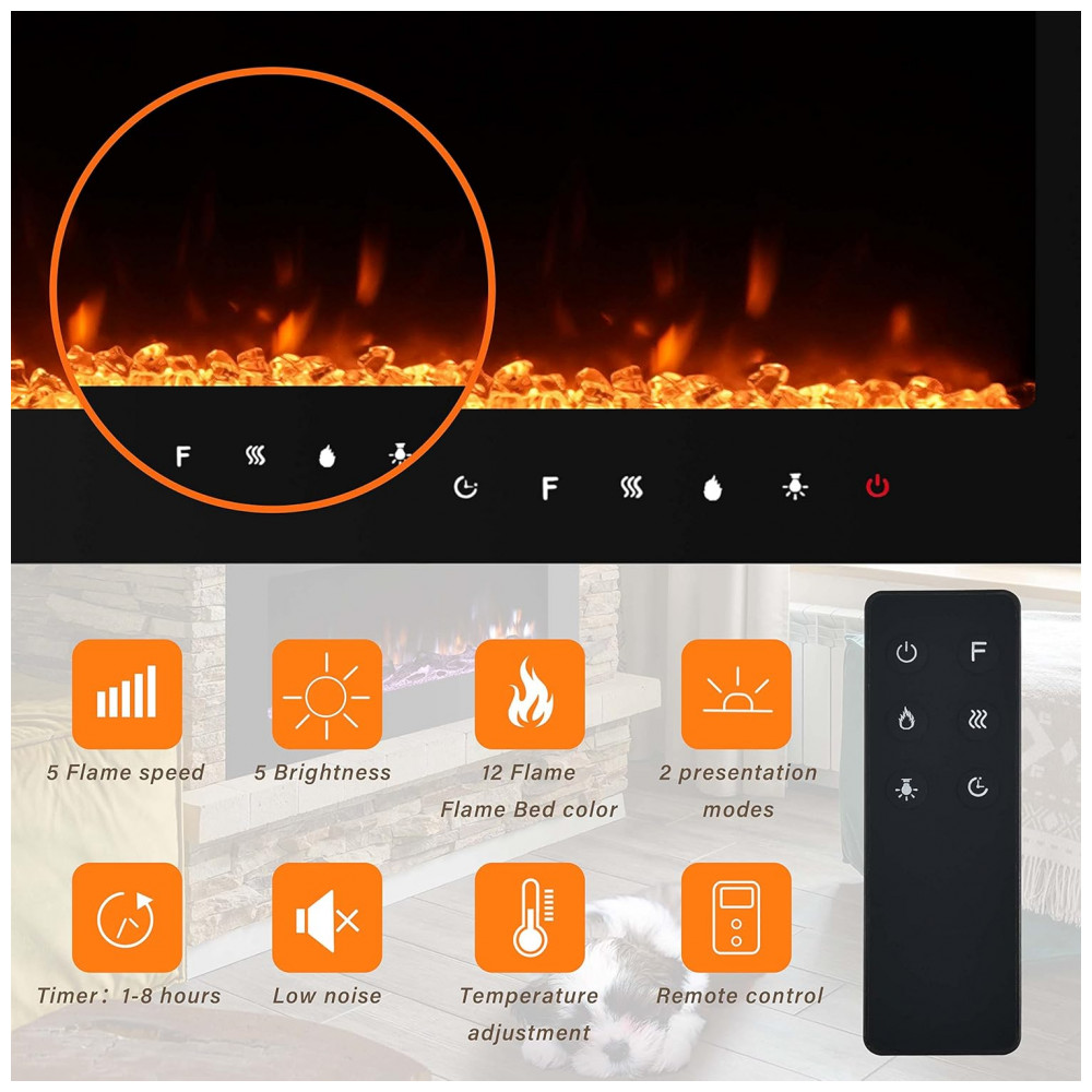 Termostato e economia de energia Esta lareira elétrica embutida possui duas configurações de calor alta 1500W e baixa 750W que pode aquecer até 37 m2. Você pode ajustá lo para fins de aquecimento e economia de energia. Também equipado com dispositivo de corte de segurança para proteção contra superaquecimento