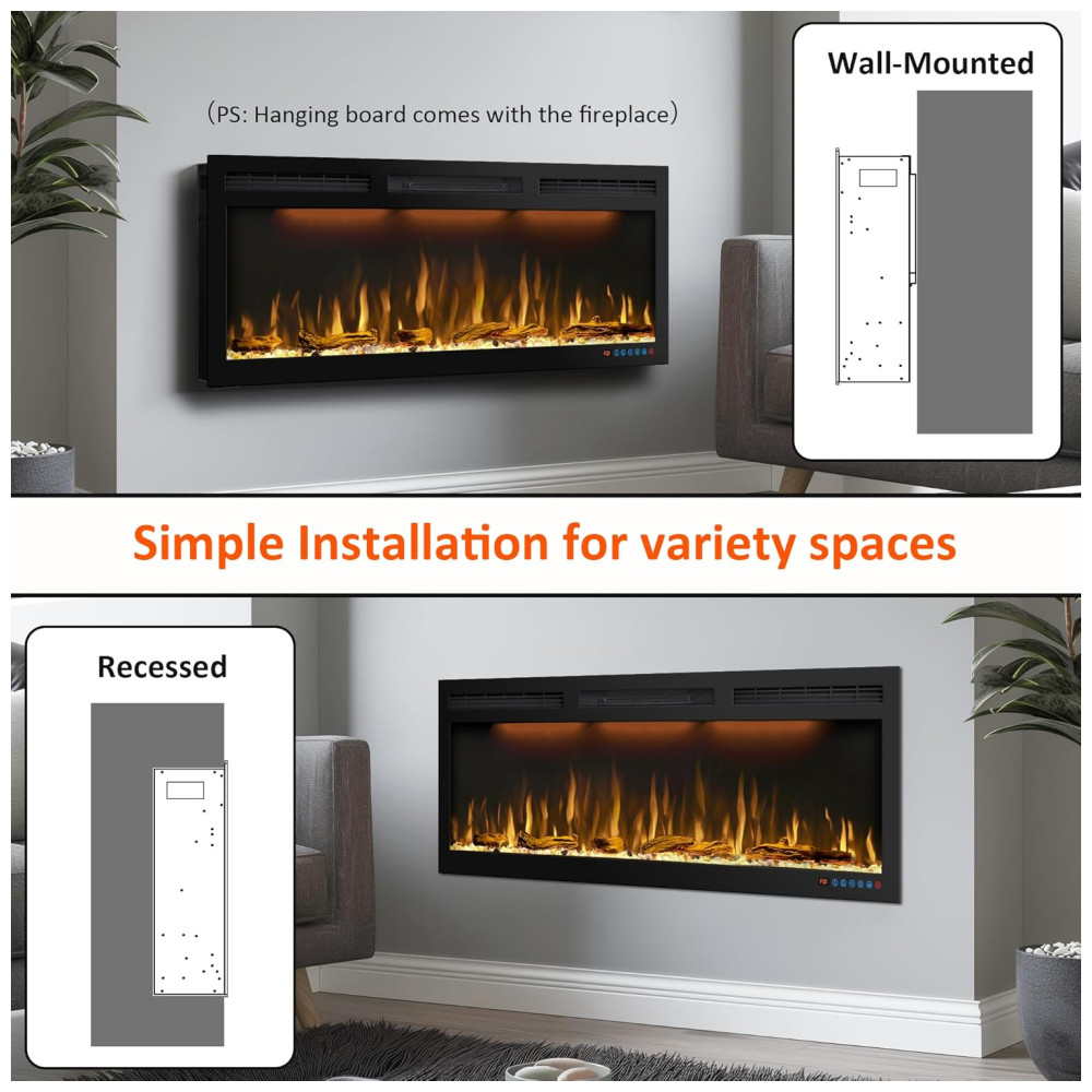 Esta lareira elétrica pode ser pendurada na parede ou embutida na parede ou na moldura. Com sua estrutura fina, é muito econômica em termos de espaço e adequada para a maioria dos locais internos. O suporte para montagem na parede acompanha a lareira e deve ser removido quando embutida na parede.