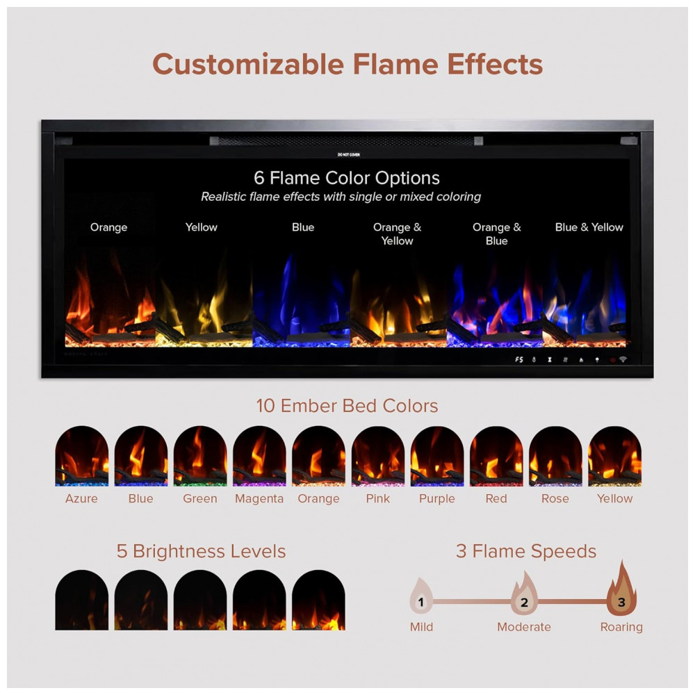 Com 5 cores de chama, 5 níveis de brilho, 3 velocidades de chama e 10 cores de base de brasas, você pode mudar o visual da sua lareira para se adequar ao seu estilo e necessidades.