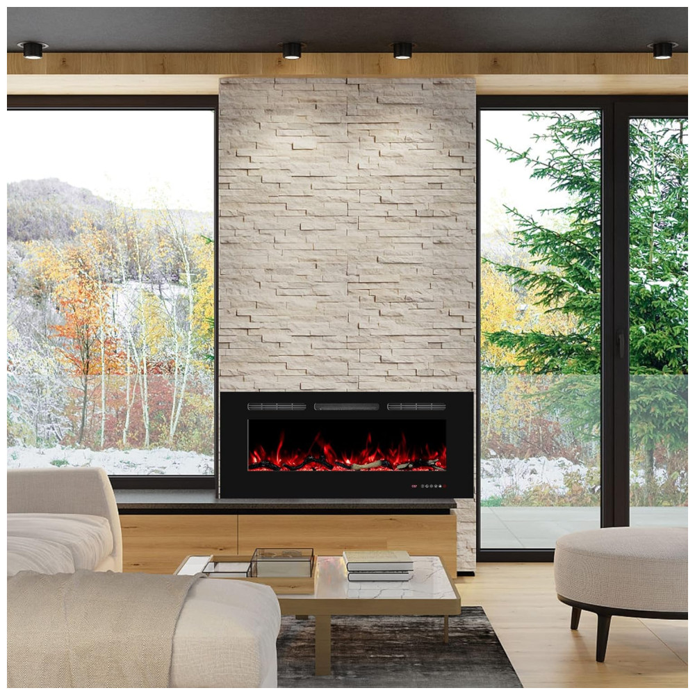 Decoração Moderna para a Casa: Moldura fina preta, área de exibição maior, painel de vidro temperado, material de ferro à prova de ferrugem, que compõem um corpo sólido com estilo moderno. Ao ligá-la, cria um efeito de fogo realista com troncos e cristais, e possui 13 cores de chama e 13 cores de leito de combustível, proporcionando um super banquete visual para sua casa aconchegante, ideal para sala de estar, quarto, sala de jantar, etc.