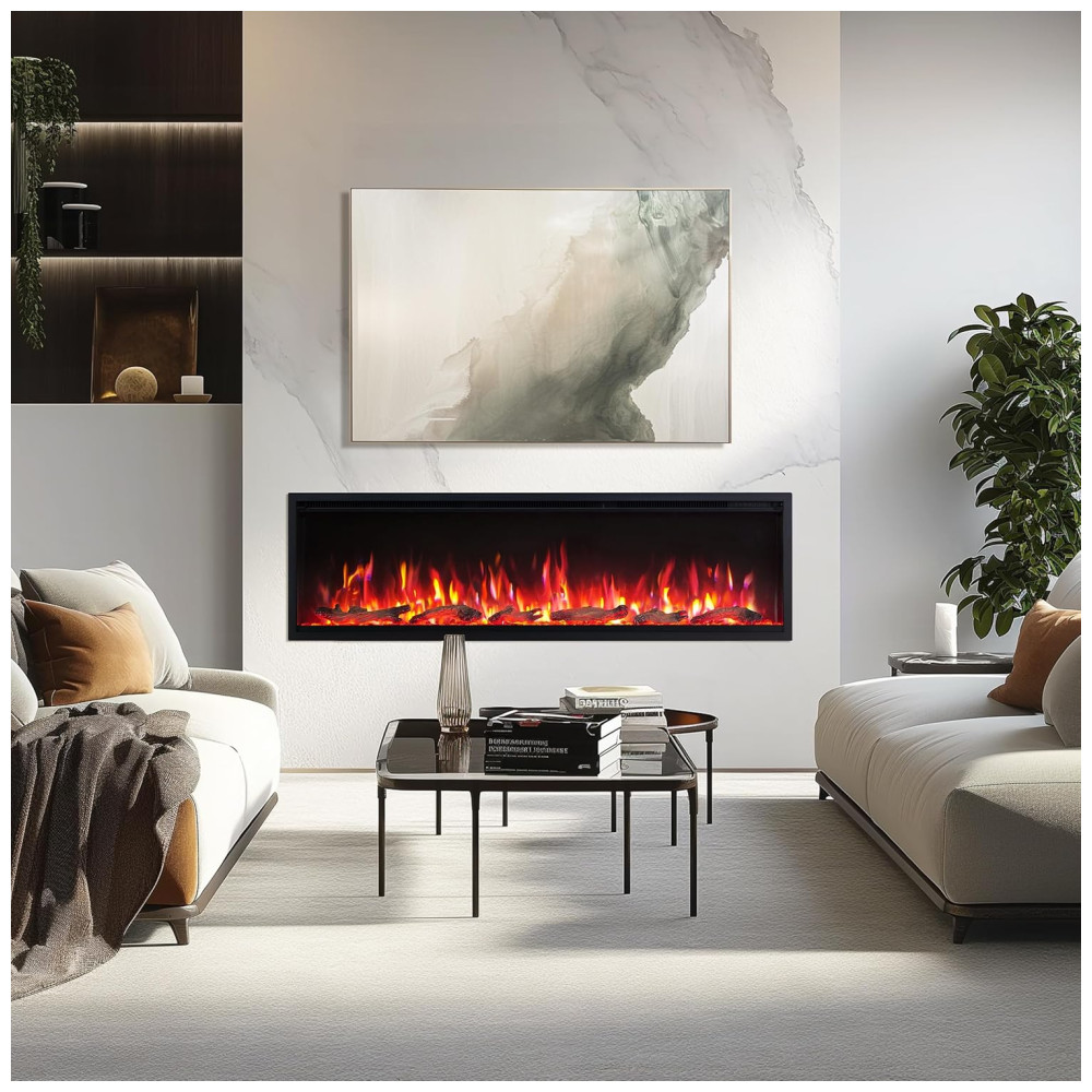 Design elegante e versátil: A lareira pode ser instalada diretamente na parede ou embutida em uma parede emoldurada ou de forma independente, oferecendo várias opções para se adaptar ao seu espaço. O acabamento de 1 largura cria uma aparência limpa e contemporânea.