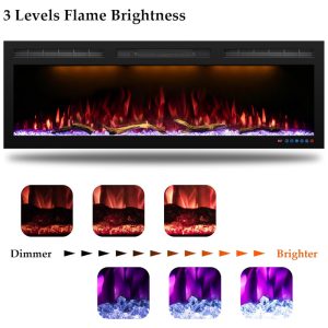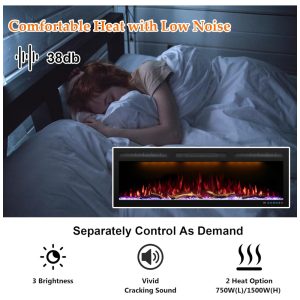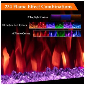Decoração Elegante: Esta lareira elétrica possui um design aerodinâmico, feita com material de alta qualidade e um painel de vidro temperado, conferindo um toque moderno. A chama multicolorida cria uma atmosfera aconchegante e tranquila, proporcionando uma sensação relaxante. Com até 234 opções de combinação de chamas!