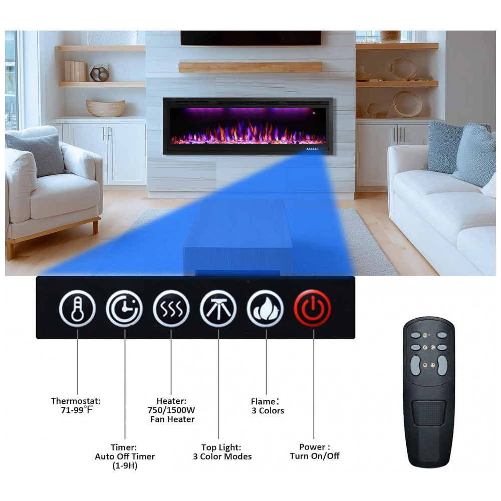 Configuração de Controle Conveniente: Este aquecedor de lareira elétrica possui duas configurações de calor: alta e baixa (1500W/750W). O alcance do termostato é de 22°C a 37°C e aquece até 37 m². Temporizador integrado de 1 a 9 horas para desligamento automático da unidade de acordo com o tempo definido. Todas as funções podem ser operadas convenientemente pelo controle remoto ou botão na tela.