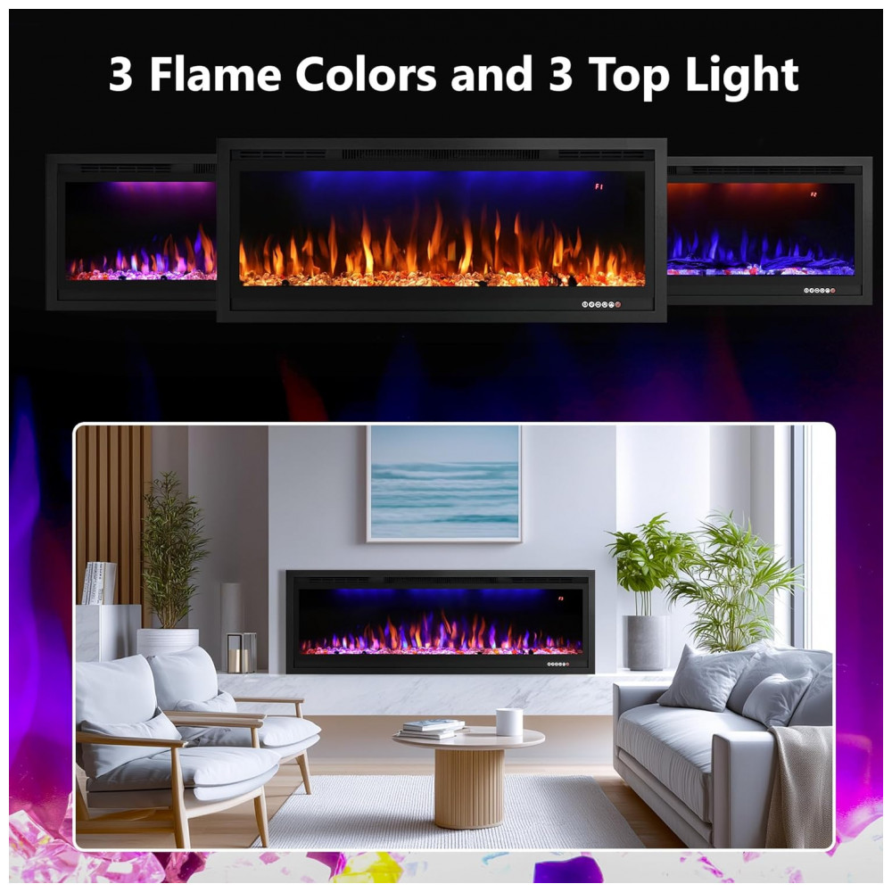 Chama Realista: Este aquecedor de lareira elétrica possui 3 cores de chama e luz superior, com 9 combinações de cores para criar uma atmosfera colorida. Cristais cintilantes e troncos simulados são fornecidos para a apresentação do leito de combustível DIY de acordo com sua preferência. O efeito de chama pode ser utilizado com ou sem aquecimento, perfeito para qualquer estação.
