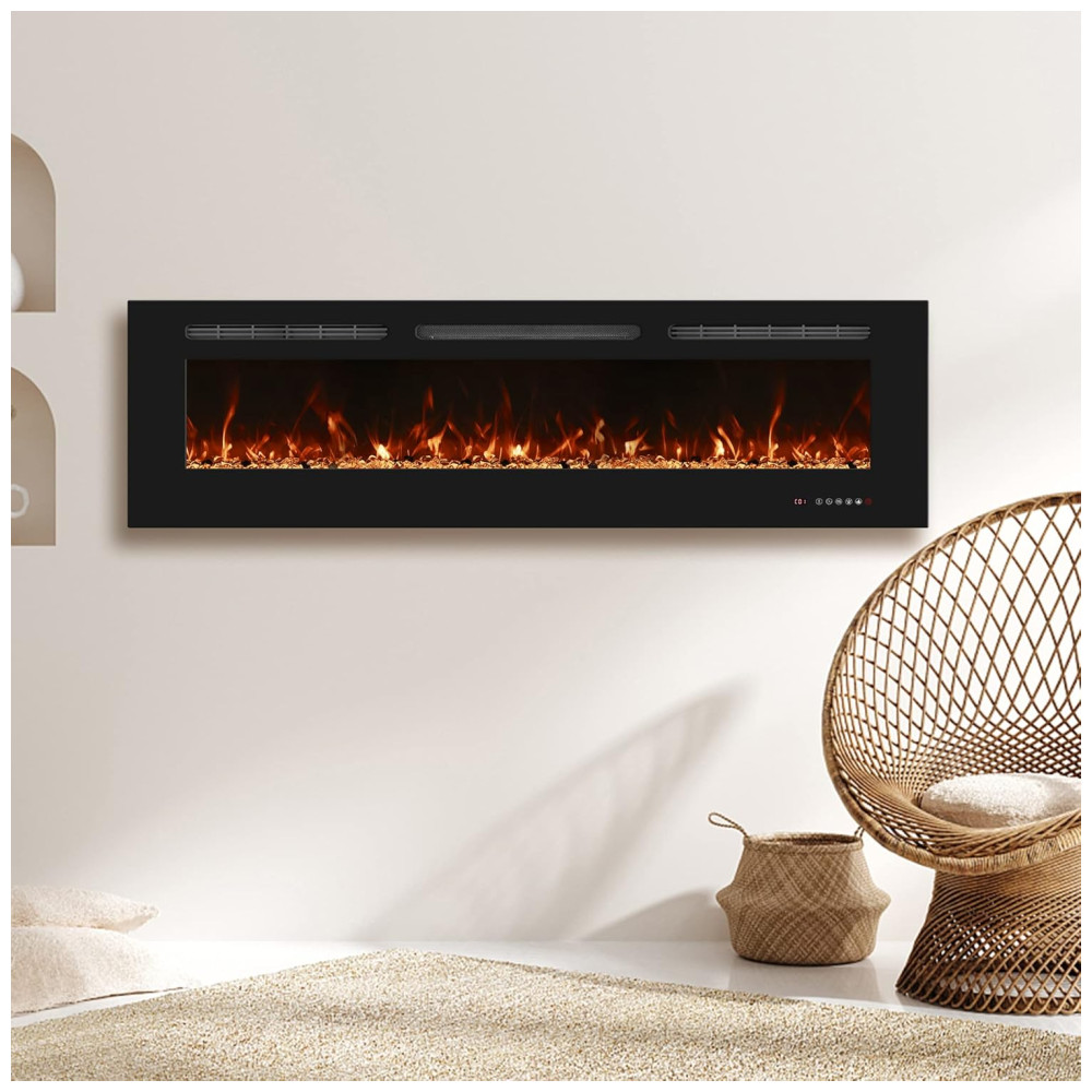 Aparência Elegante e Qualidade Superior: Esta lareira elétrica embutida possui um painel de vidro temperado preto resistente ao calor que destaca o brilho do fogo. Os painéis sensíveis ao toque desaparecem após alguns segundos, restaurando a aparência elegante semelhante a um espelho e mostrando a bela chama, tornando-a deslumbrante em diversas decorações. A estrutura firme e à prova de ferrugem é feita de metal de ferro, um excelente material para proteção.