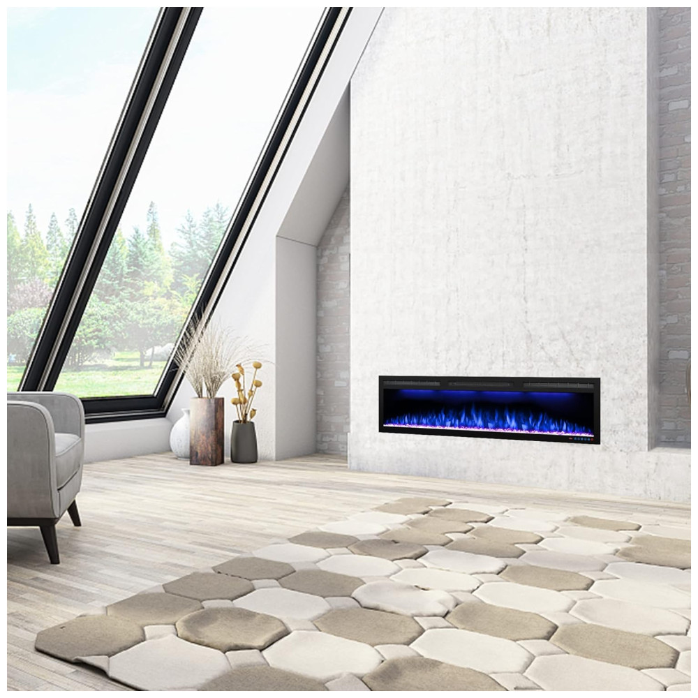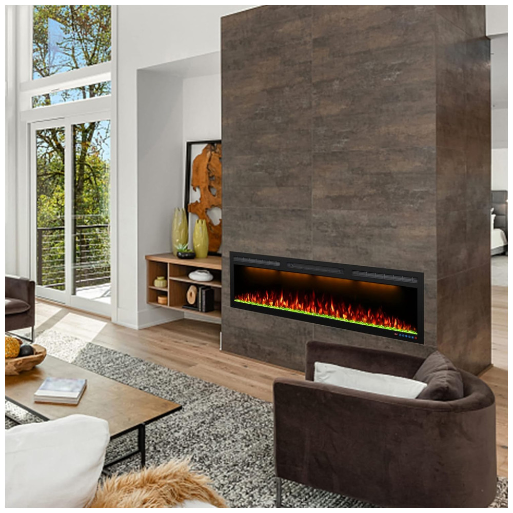 Decoração elegante Esta lareira elétrica tem uma aparência aerodinâmica, é feita de material de alta qualidade e um painel de vidro temperado e apresenta um toque moderno. Quando a chama multicolorida queima na caixa da lareira, criando uma atmosfera calorosa e pacífica, trazendo nos uma sensação de relaxamento. Até 234 opções de combinação de chamas