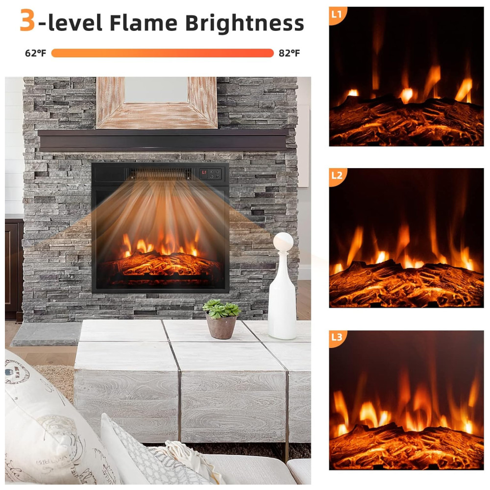 Brilho da Chama em 3 Níveis: Esta lareira elétrica é projetada com 3 níveis de brilho da chama (alto, médio, baixo) para satisfazer suas diferentes necessidades. Ao mesmo tempo, as chamas 3D realistas proporcionam um prazer visual incomparável. Além disso, tanto o efeito de chama quanto o aquecimento podem ser controlados separadamente.