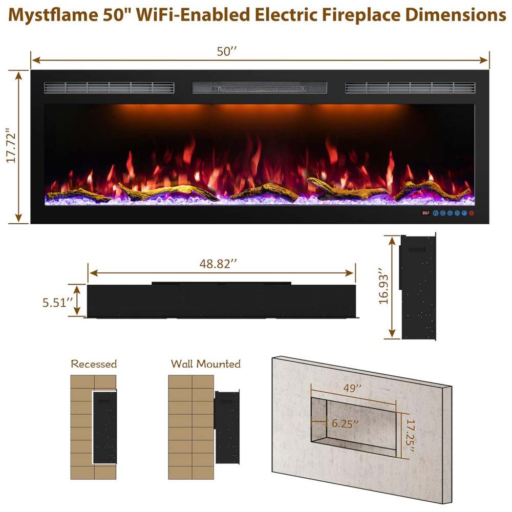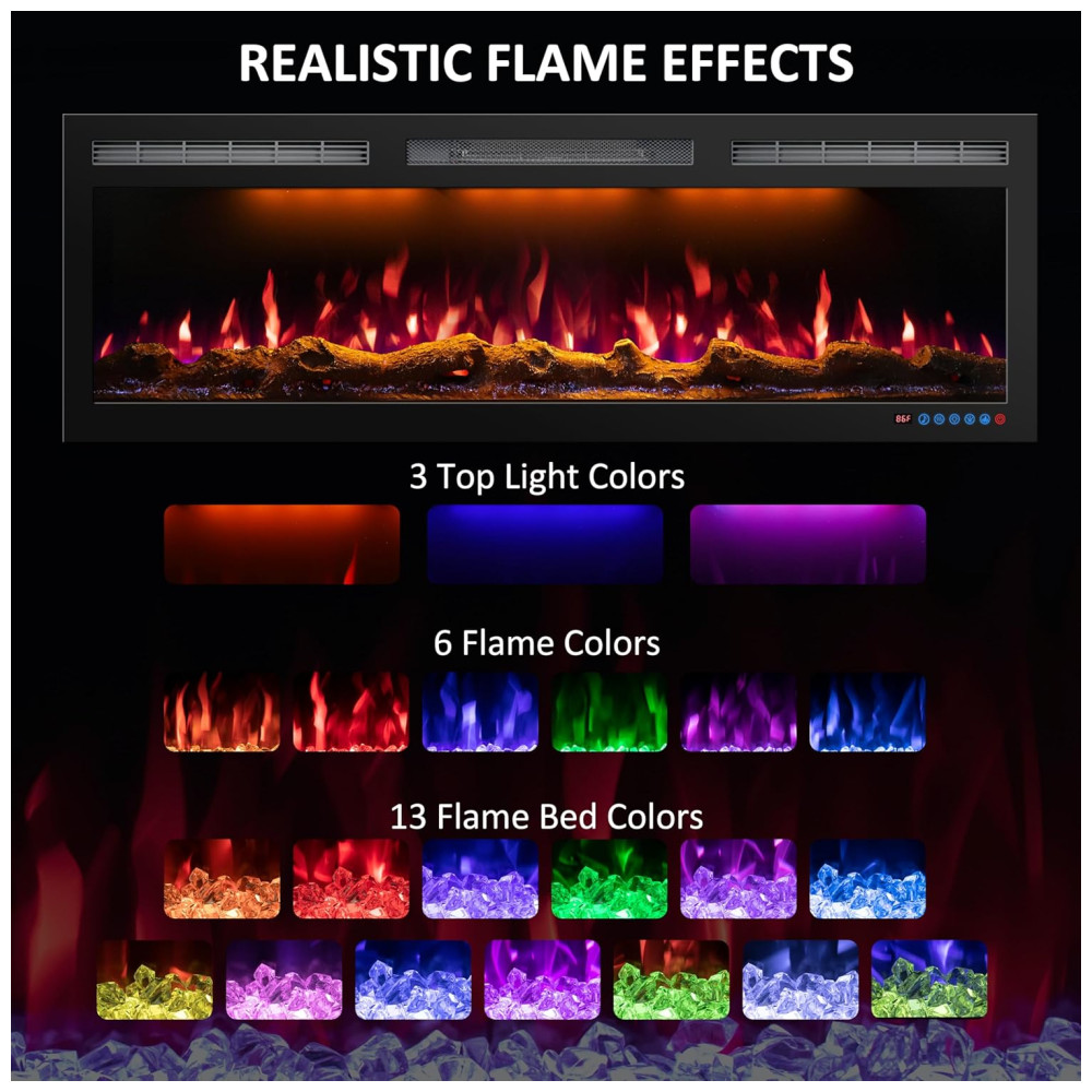 VÁRIAS FUNÇÕES Este aquecedor de lareira fino tem 3 luzes superiores. Estão disponíveis 6 cores de chama e 13 cores de cama de chama. 3 brilho selecionável. Ajuste as mudanças de acordo com o seu humor. Vem com troncos e cristais e é combinado com ele. Reflete perfeitamente o efeito de chama realista. O alto falante log pode fazer o efeito de queima de log real. 750W, 1500W aquecedor sopra ar quente, ar quente.
