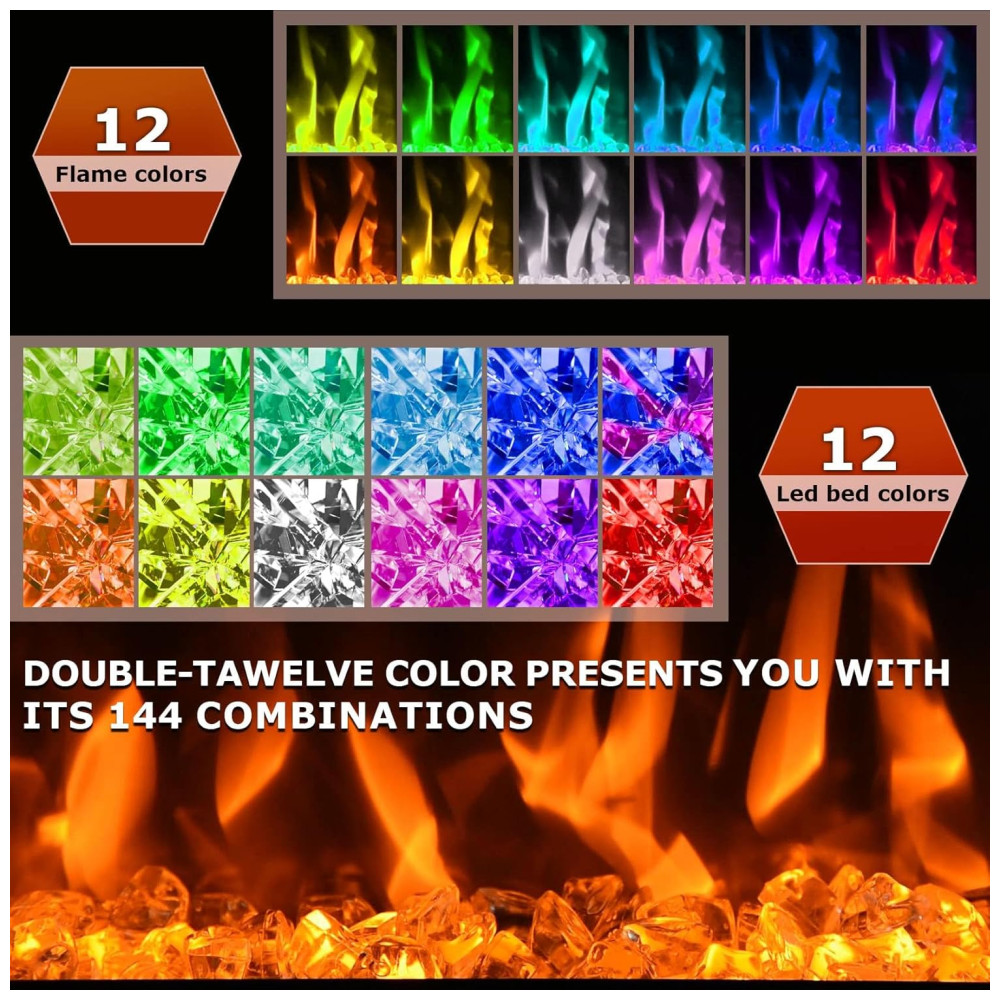 A lareira oferece 12 cores de chama e 12 modos de cor da base de brasas LED, dando opções de diferentes ambientes e uma gama de seleção de cores de fogo. As cores LED de espectro completo refletem nas pedras de vidro cristal espelhadas para criar um efeito bonito e colorido.