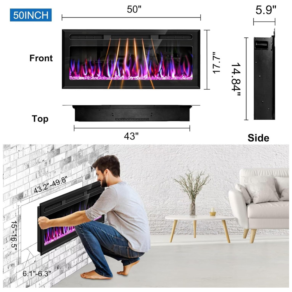 A lareira elétrica pode ser montada na parede ou embutida. A lareira elétrica preta possui uma superfície de vidro temperado espelhado com bordas pretas e uma estrutura de metal escuro, que complementa o espaço perfeitamente, ideal para sua sala de estar, quarto, porão ou centro de entretenimento.