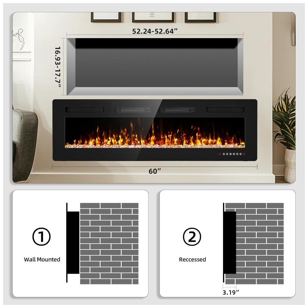 Transforme seu ambiente com esta lareira versátil e elegante. Pode ser embutida na parede ou montada na parede para um visual moderno e elegante. Desfrute do ambiente acolhedor de uma exibição de chamas realista em qualquer cenário. Ideal para uso residencial, comercial e em escritórios.