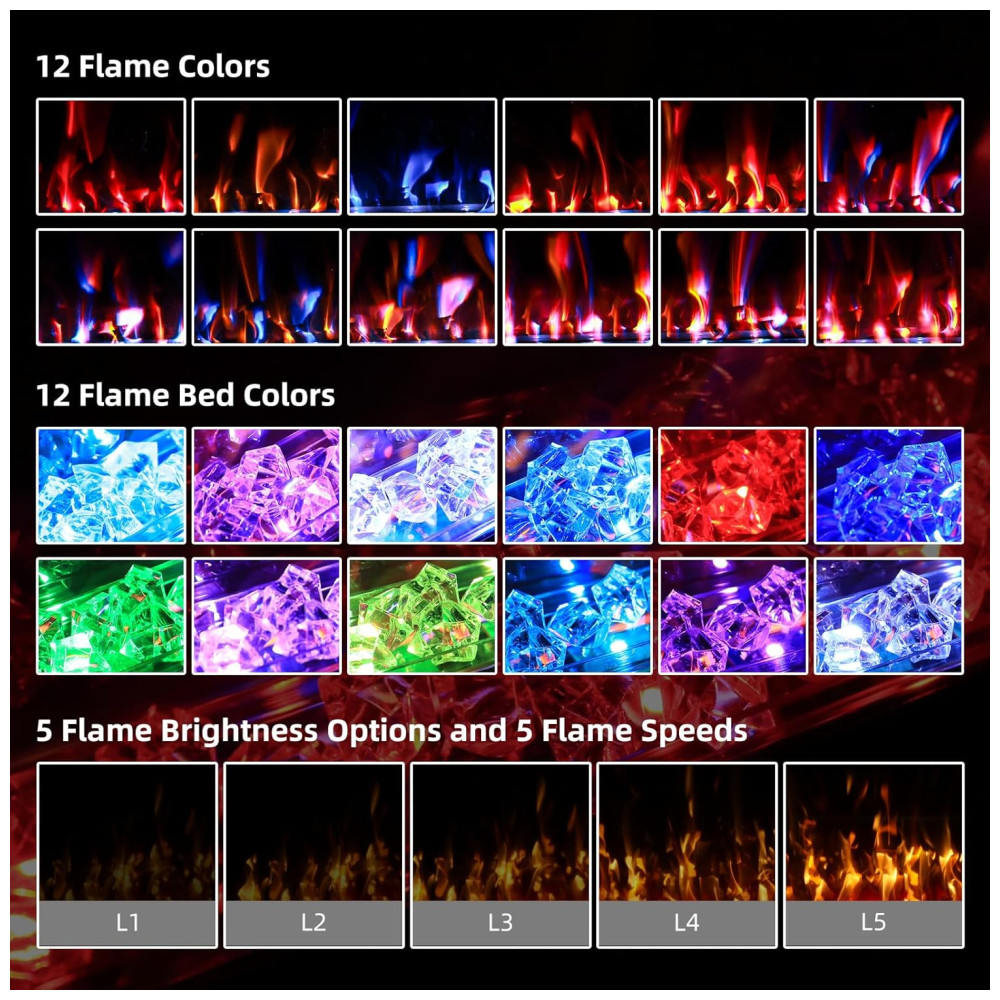 Quer você deseje um brilho quente e relaxante ou uma exibição vibrante e animada, você pode alcançá-lo com esta lareira. Use o controle remoto fornecido e escolha entre 12 cores de chama, 12 cores de leito de chama, 5 modos de velocidade de chama e 5 níveis de brilho. Esta lareira adicionará charme e elegância à sua casa com suas chamas atraentes.