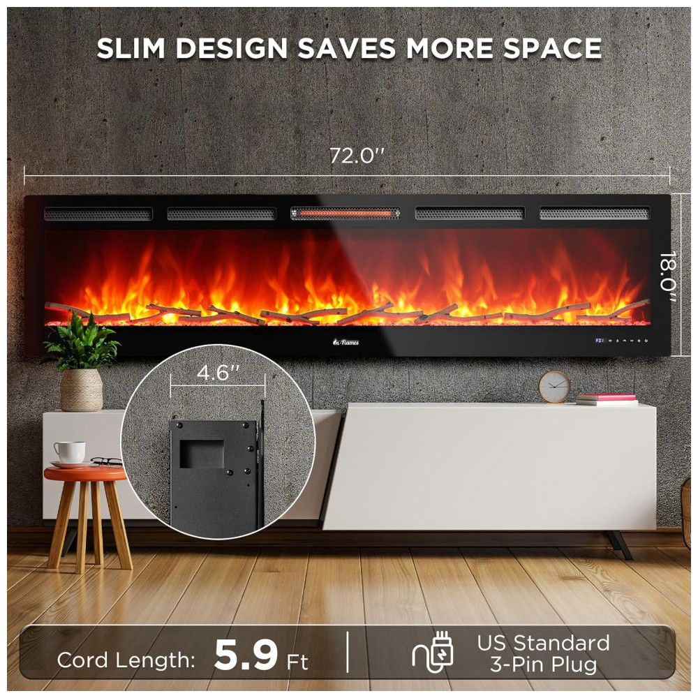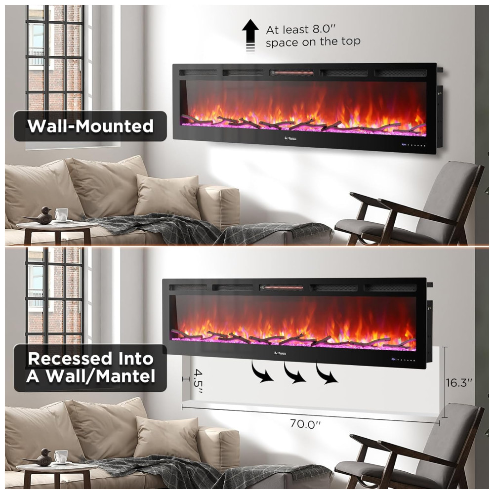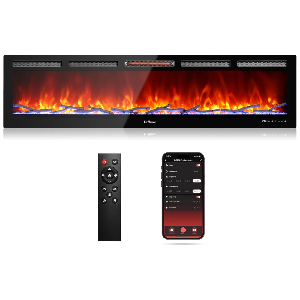 Lareira Elétrica de Embutir A45x182L cm com Estalo Sonoro Chama Realista Controle Remoto e APP 110V 1500W TURBRO Preta
