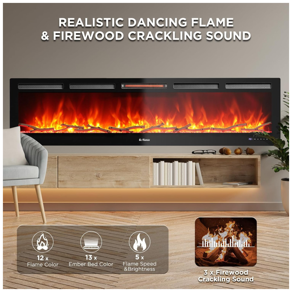 Sua chama realista, que salta, dança e tremeluz enquanto a lenha crepita e estala, cria uma atmosfera única e acolhedora. São 12 cores de chamas e 13 opções de cores para o leito de brasas, permitindo combinações personalizadas, além de ajustes de velocidade e brilho da chama. Para uma experiência ainda mais completa, a lareira oferece três níveis de som, para simular o som do fogo crepitando.