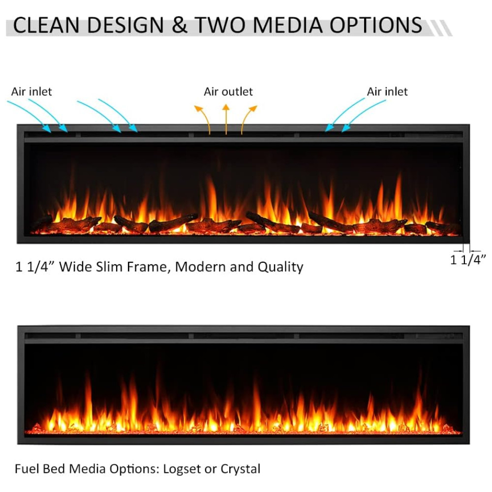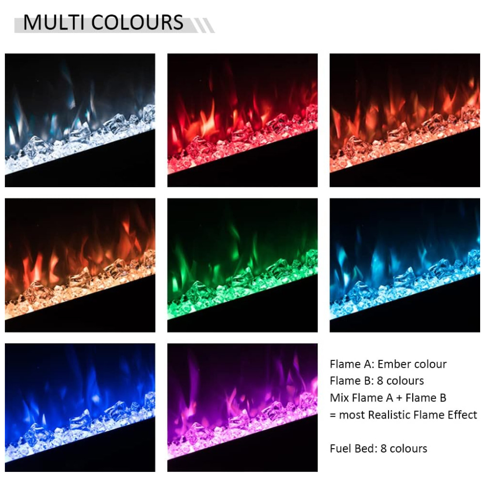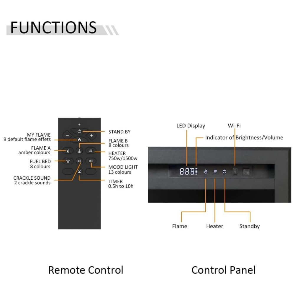 MULTI COMBINAÇÕES DE CHAMA A chama moderna e realista cria uma sensação de chama realista Incluindo as duas opções de leito de combustível conjunto de toras e pedra de cristal. Chama multicolorida e cama de combustível em 5 configurações de brilho, sons crepitantes para se adequar aos seus diferentes humores alegres ou pacíficos em diferentes ocasiões. O efeito chama e crepitação pode ser com ou sem calor.