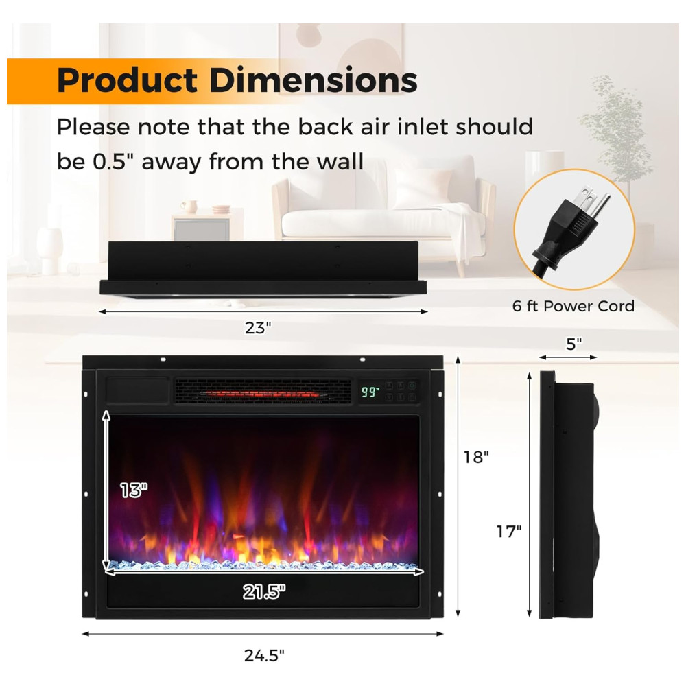 Lareira Elétrica de Embutir A45x63L cm com 6 Cores de Chama 5 Opções de Brilho Temporizador de 8H Proteção Contra Superaquecimento e Controle Remoto 110V 1500W COSTWAY Preta