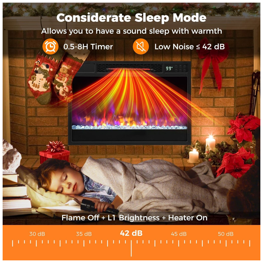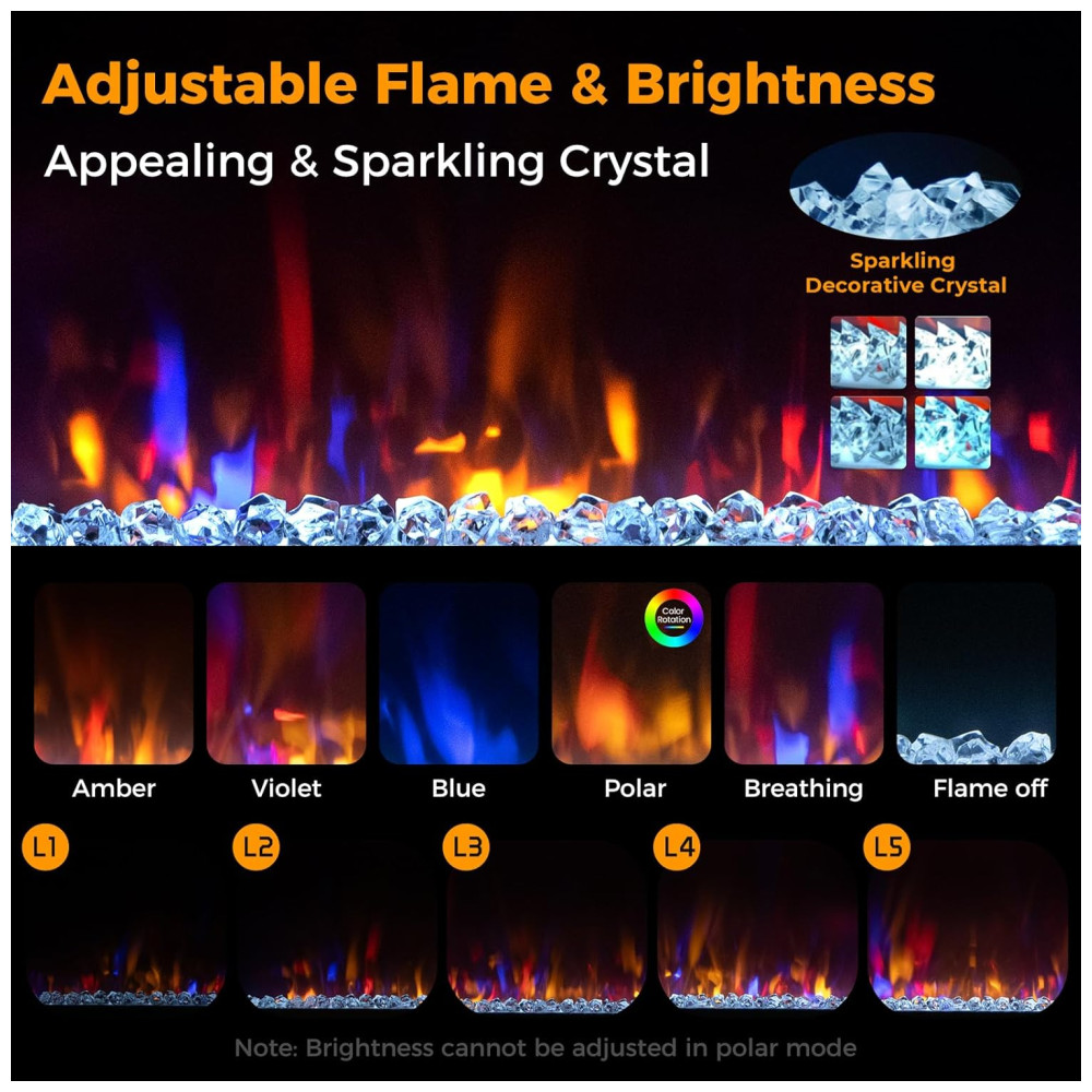 A lareira elétrica possui 6 opções de chamas e 5 níveis de brilho, criando efeitos de chamas vibrantes e atraentes que podem ser exibidos com ou sem calor, proporcionando um ambiente acolhedor durante todo o ano.