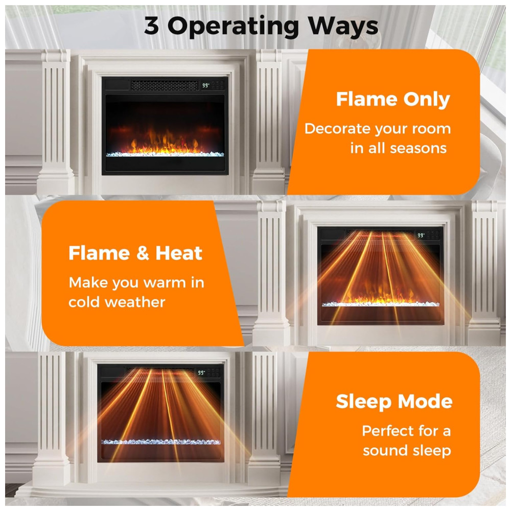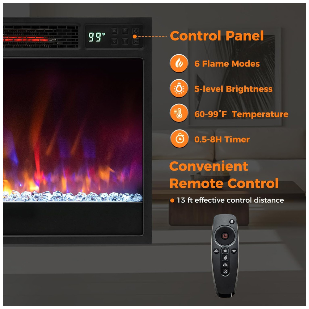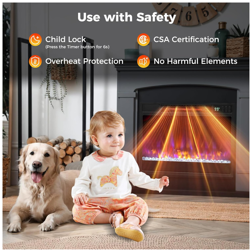 Você pode controlar facilmente a temperatura e o temporizador por meio de dois métodos: o painel de controle integrado ou o controle remoto incluído. Com certificação CSA e proteção contra superaquecimento, a lareira garante segurança adicional para você e sua família.