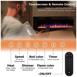 Multifunções O controle remoto e a tela sensível ao toque tornam mais conveniente controlar todas as funções da lareira elétrica, interruptor de alimentação, controle do temporizador de 1 a 8 horas, interruptor independente de aquecimento e chama, cor e velocidade da chama ajustáveis, função do modo de suspensão