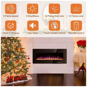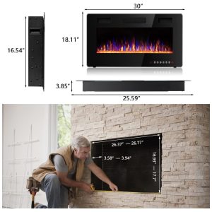 Múltiplos métodos de instalação Esta lareira elétrica não só pode ser embutida ou semi rebaixada na parede, mas também pode ser montada na parede, ajuste perfeito para paredes de pinos de 5×15 centimetros. Tamanho do produto 76x45x9 centimetros. A espessura da lareira elétrica atualizada é reduzida para 9 centimetros e não será intrusiva na parede. Pode ser instalado na sala ou no quarto, mas precisa ficar longe de outros eletrodomésticos.