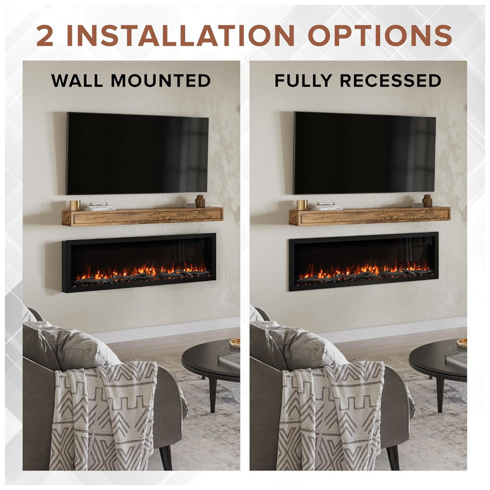 A lareira elétrica linear Altamark de é uma escolha elegante e versátil para qualquer ambiente. Pode ser instalada diretamente na parede ou embutida em uma parede ou moldura, proporcionando um acabamento perfeito e integrado ao seu espaço.