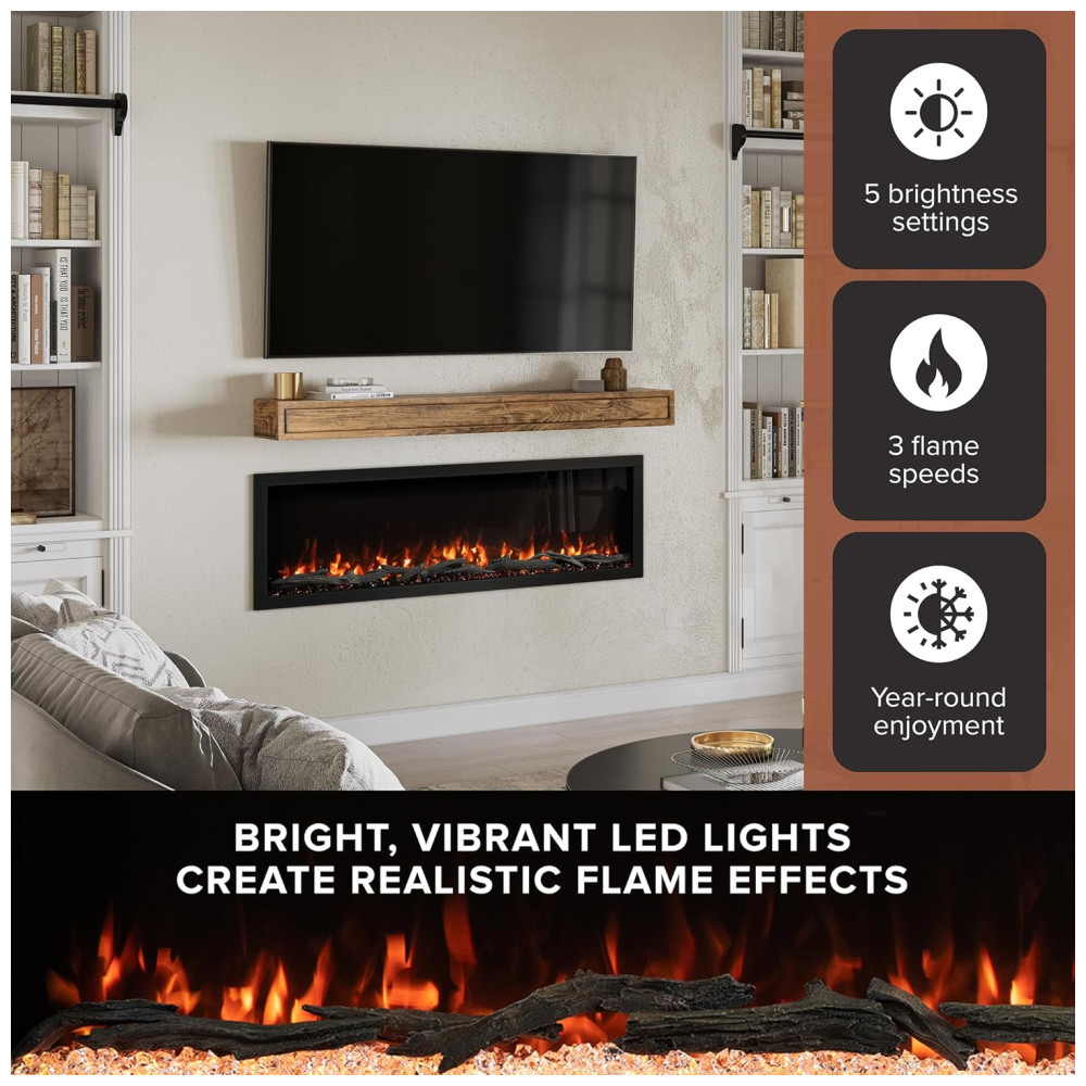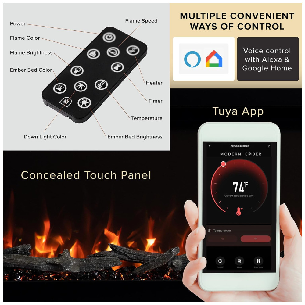 Componentes incluído: Cristais de cama de brasa, controle remoto, conjunto de toras de madeira flutuante, design de ventilação oculto e kit de tomada de encaixe