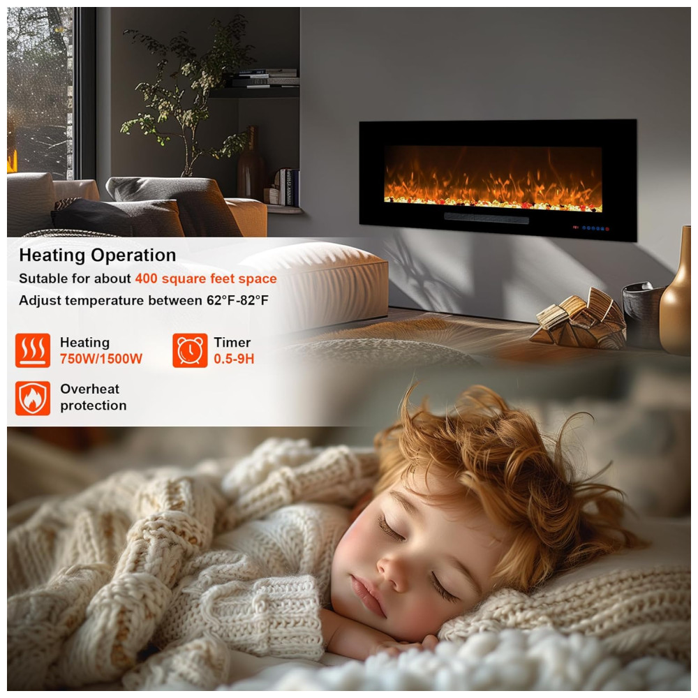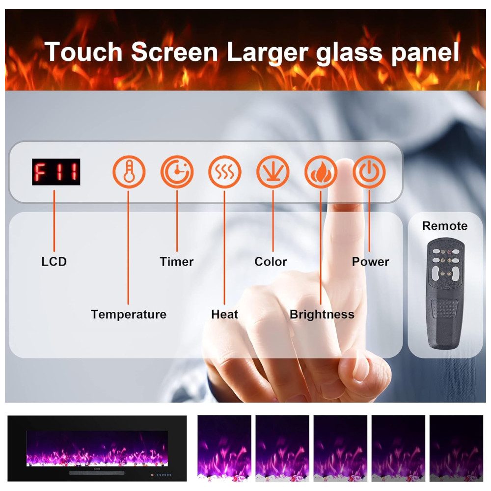 Funções Práticas e Operação Fácil: Esta lareira elétrica montada na parede possui dois níveis de potência e um termostato com faixa de 22°C a 37°C, além de temporizador de 1 a 9 horas. Exceto pela saída de calor, a superfície da lareira pode ser tocada normalmente. Cada função pode ser operada por tela sensível ao toque e controle remoto.
