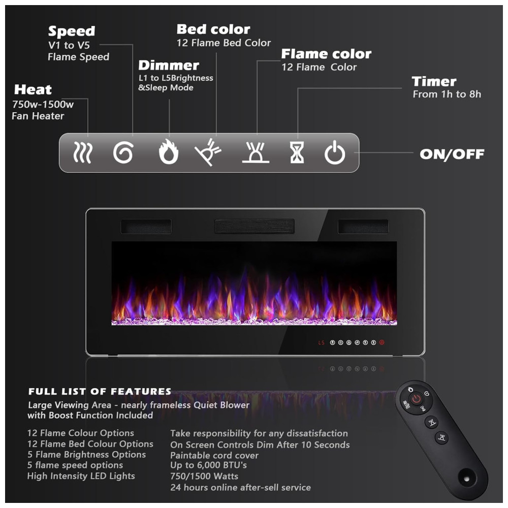 Fácil de operarRemoto e tela sensível ao toque tornam mais conveniente controlar todas as funções da lareira elétrica, interruptor de alimentação, controle do temporizador de 1 a 8 horas, interruptor independente de aquecimento e chama, cor e velocidade da chama ajustáveis, função do modo de suspensão.